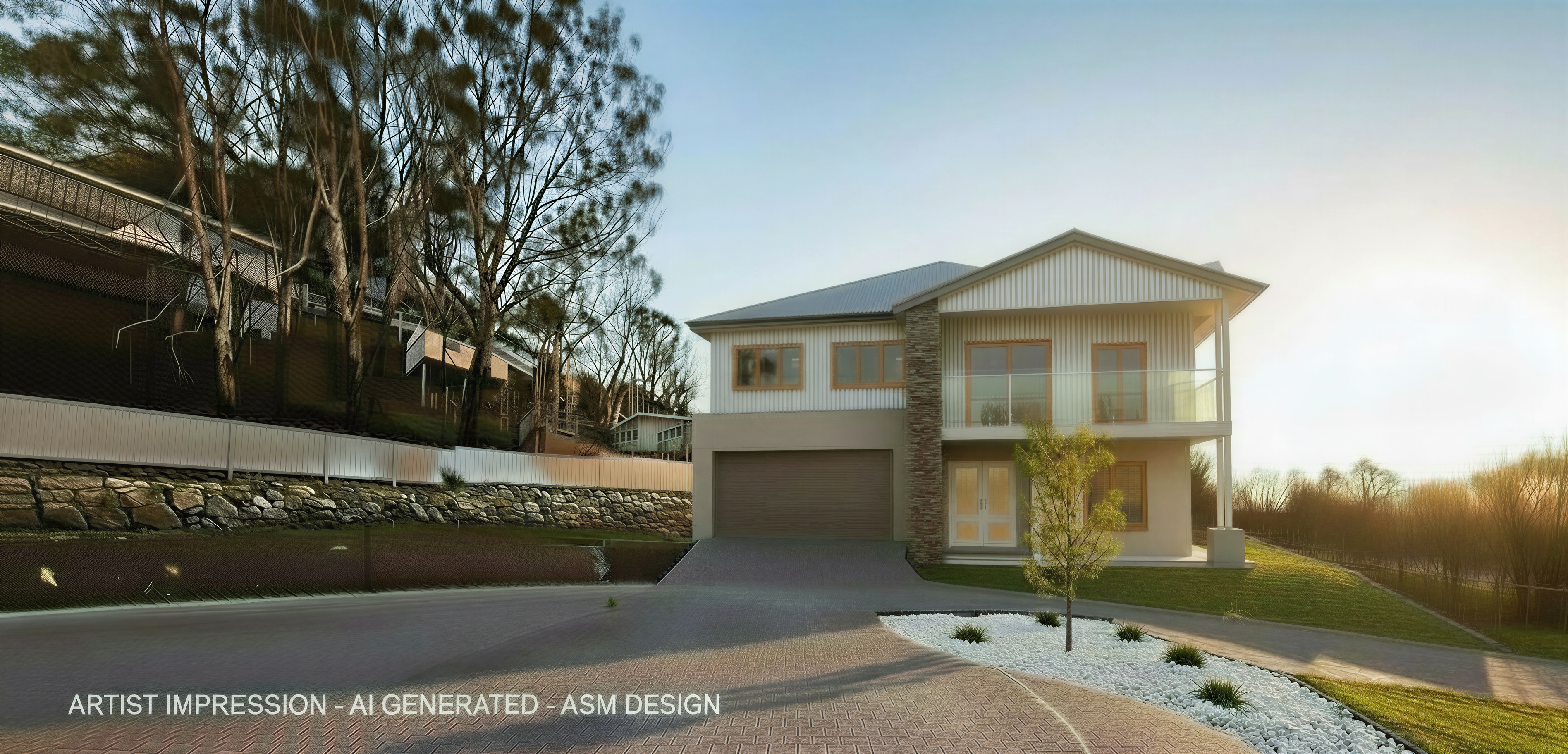 modernist exterior shot modernist exterior shot sharpen colour to house sunrise front right of house include shadows no other changes to image architecture architecture