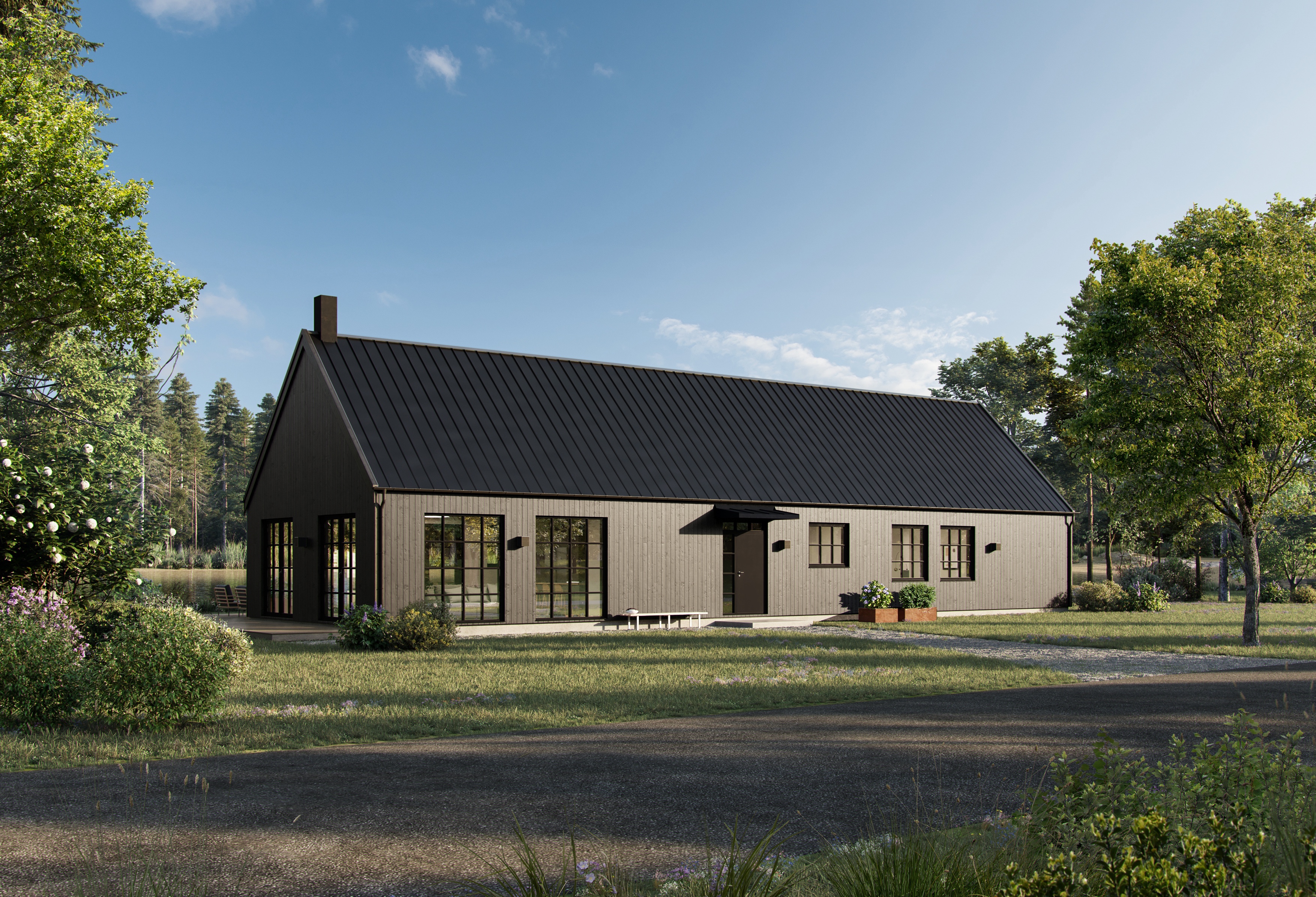turn this 3d image into a perfect photographic picture do not change anything on the house put an airedale terrier on the front lawn