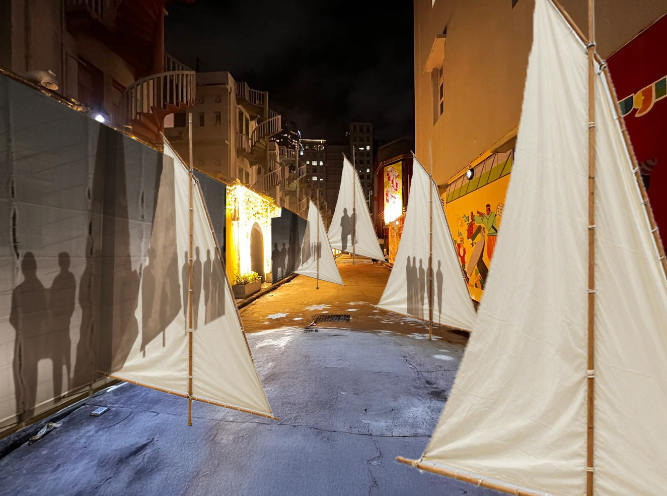 a singapore alleyway at night featuring a light art installation phinisi masts of different heights scattered across the alley at the base of each mast is made up of wave like fabric mesh shadows of people are cast onto the walls as the alley is filled with people spotlights illuminate key areas creating sporadic glows through the space