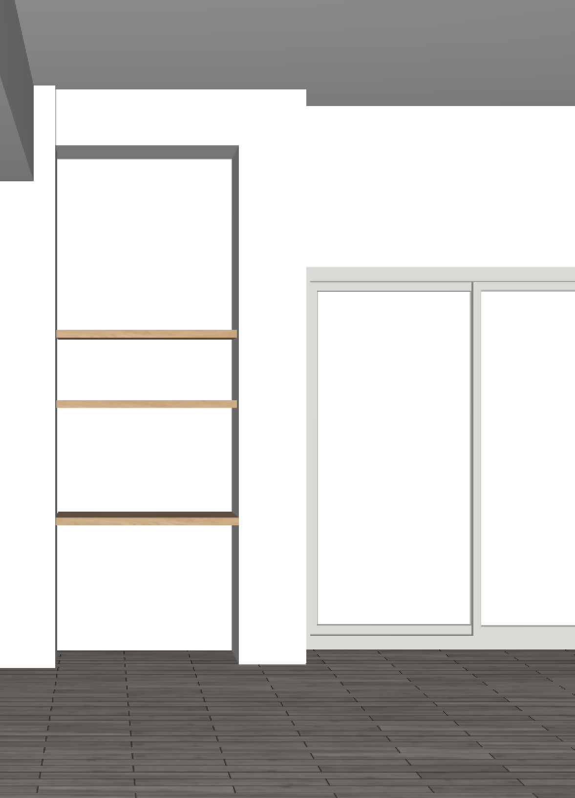 render a modern interior space with a minimalist design the walls are smooth and painted a crisp ivory white exuding a clean and airy atmosphere the shelves are crafted from light oak wood adding a touch of warmth and natural charm the ceiling is a soft gray complementing the sleek contemporary aesthetic the floor is covered in dark gray polished tiles reflecting a sophisticated elegance large sliding glass doors frame the right side enhancing the room with natural light and a feeling of openness and tranquility
