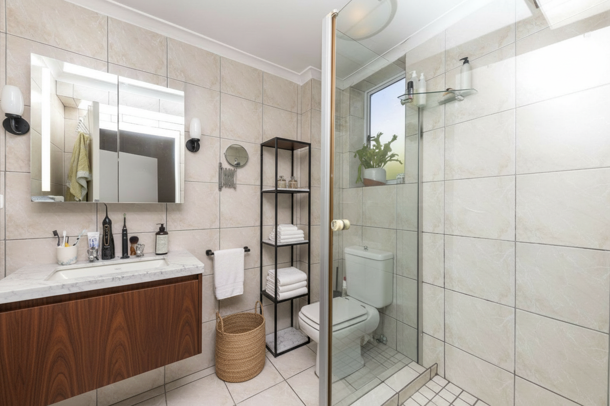 midday low saturation metal louvres on carport grass on side bank keep driveway concrete