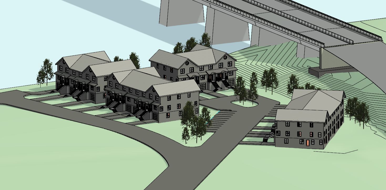 this image is a base image lock the geometry of the buildings bridge roads and camera view i would like you to add color and materials to the building that would be typically seen on townhomes in point pleasant new jersey make the white trees look like medium sized trees native to new jersey add grass where there aren t roads buildings water or the bridge make this image look as photorealistic as you can make it show the road and bridge surface as asphalt show the bridge s structure as concrete when designing the exterior of the buildings please make sure they all follow the same pattern when it comes to color and materials