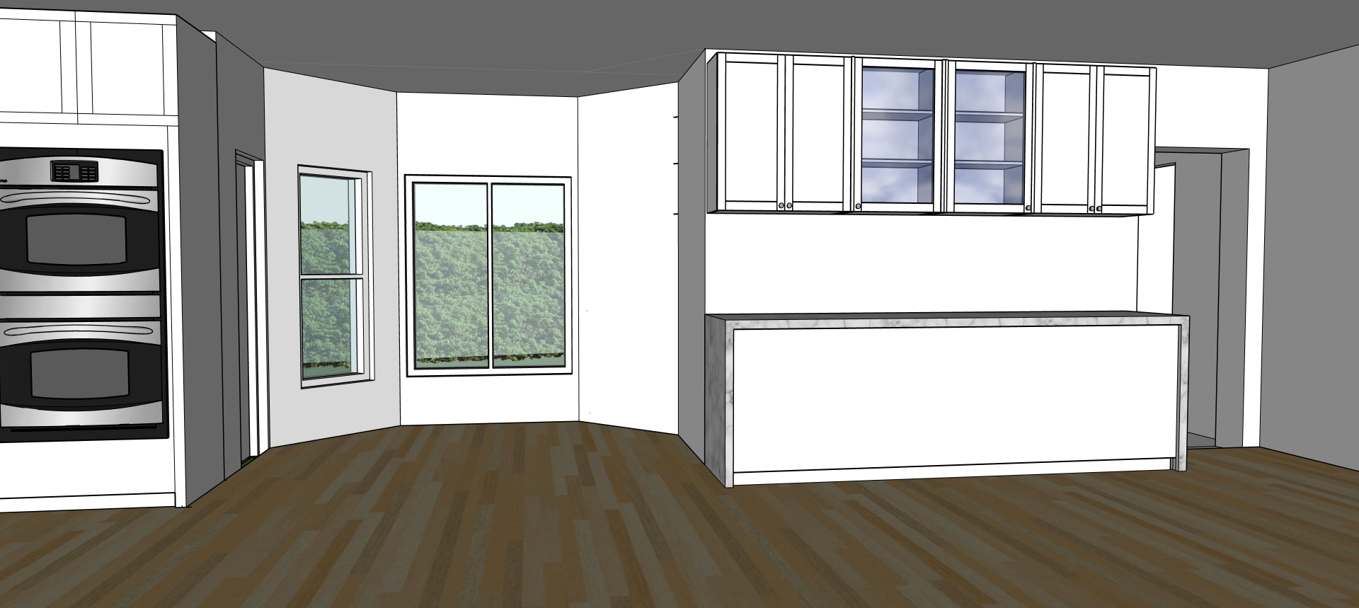 interior with a warm and inviting atmosphere use soft white for the cabinets and stainless steel for the oven incorporating a subtle brushed texture the countertops should be marble with gentle gray veining choose a light oak wood finish for the flooring giving a warm natural appeal the windows reveal a lush green garden view outside capturing vibrant shades of green ensure natural light floods the space creating a bright and airy feel emphasize clean lines and a minimalist design aesthetic keep design layout and just modify textures and colors as described