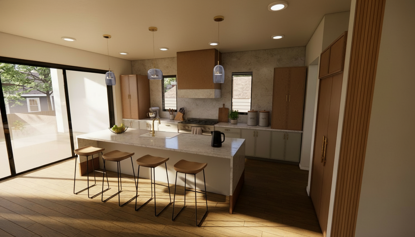 convert this floor plan into a realistic isometric 3d view of a full house show the space from an elevated angle with furniture walls and details visible style modern coastal boho accents palette warm white oak sand matte black materials wood quartz linen textures use the same furniture as shows on the plan do not change the orientation of the floorplan