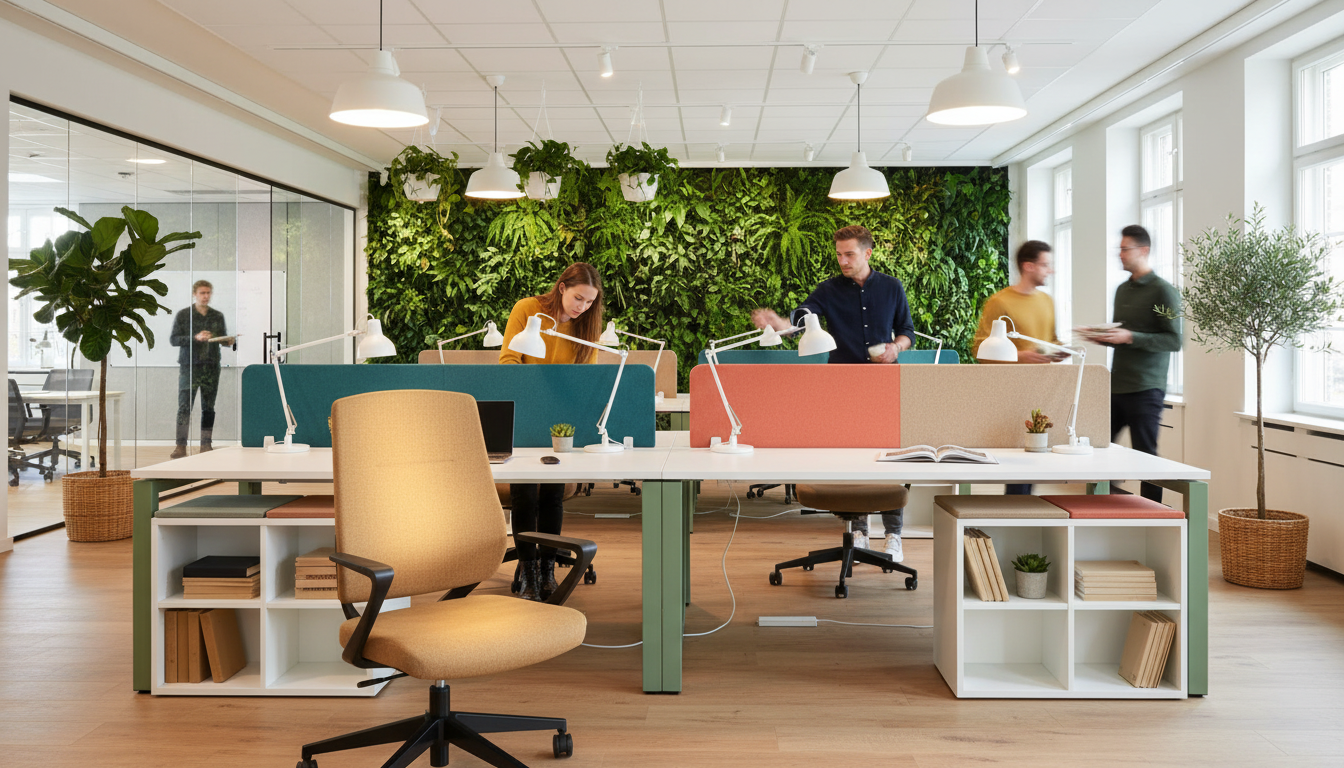 vibrant scandinavian open plan office photography hero camel fabric office chair at front left workstation fully sharp and rendered slight 3 4 angle chair commanding foreground presence background scene lively nordic open office four person white oak bench workstations sage green powder coated steel frame legs colorful acoustic screen dividers teal coral warm beige white adjustable led task lamps monitors laptops notebooks across all desks white mobile pedestals open bookshelf end units people all in natural busy poses young woman at workstation behind hero chair leaning over desk reviewing printed documents brown hair mustard yellow sweater engaged expression man standing at desk two positions right pointing at monitor screen explaining to colleague navy shirt rolled sleeves two colleagues at far workstation in animated discussion one showing laptop screen to other slightly blurred person walking through background carrying coffee cups motion blur standing person at whiteboard in glass meeting room visible behind plants large fiddle leaf fig in woven rattan planter far corner living green wall panel covering back wall lush ferns pothos philodendron cascading small succulents on each workstation desktop hanging pothos from ceiling planter above walkway potted olive tree beside glass partition lighting abundant natural daylight from full height windows green wall reflecting fresh light into space warm pendant cluster above workstation area camel chair catching overhead warm light honey tone glowing vibrantly color palette warm oak sage green teal coral living green wall warm camel chair hero style fast company future of work editorial 8k energetic and human chair as warm anchor ar 16 9 style raw stylize 230 q 2