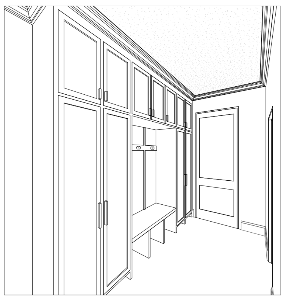 interior shot a modern elegant hallway with sleek cabinets and storage benches painted in soft ivory white the walls are adorned with light beige wallpaper enhancing the warm welcoming atmosphere the ceiling features soft recessed lighting casting a gentle glow the handles and accents are brushed brass adding a touch of sophistication the floor is a rich polished walnut hardwood offering a striking contrast a large framed mirror at the end reflects natural light making the space feel airy and open an atmosphere of calm and refined luxury