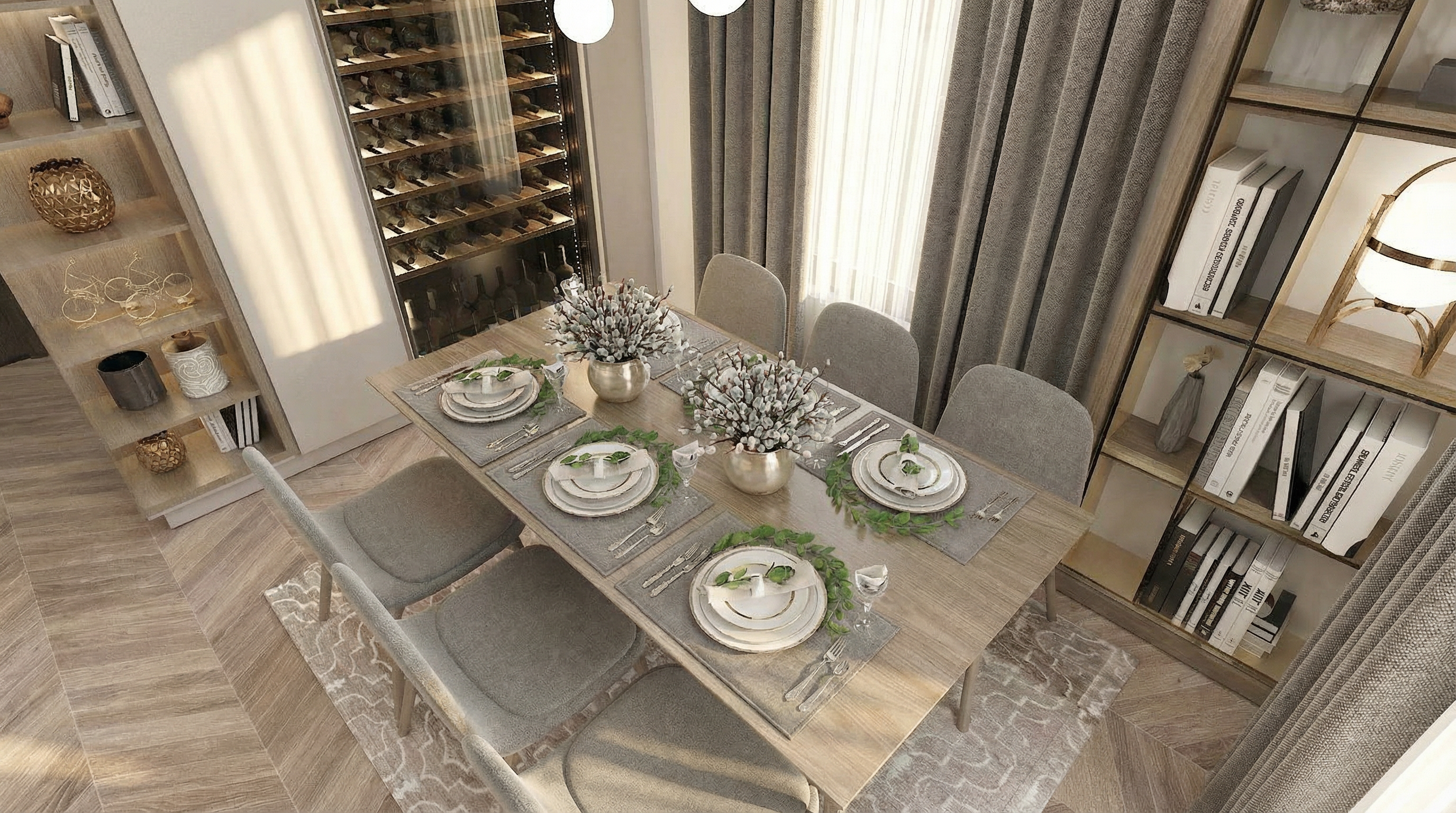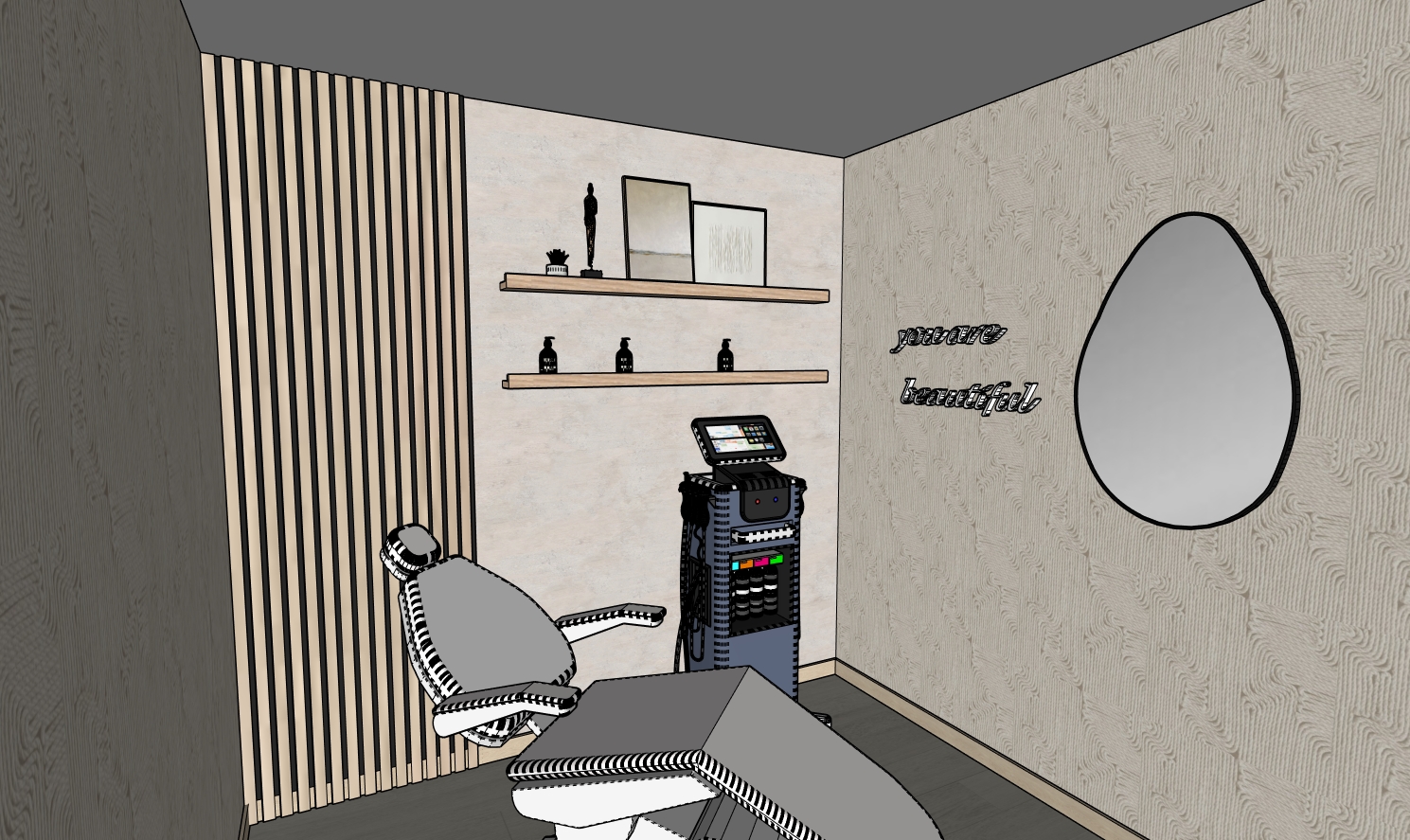 produce an ultra photorealistic render of this space with full material enhancement and lighting refinement keep the exact composition perspective architecture and furniture layout unchanged enhance textures fabric wood stone glass with higher resolution detail natural imperfections and realistic reflections introduce warm indirect artificial lighting to create depth balanced contrast and a calm elegant ambiance preserve the original design but elevate realism clarity and visual richness add 1 soft led light strip into the acoustic wall panel
