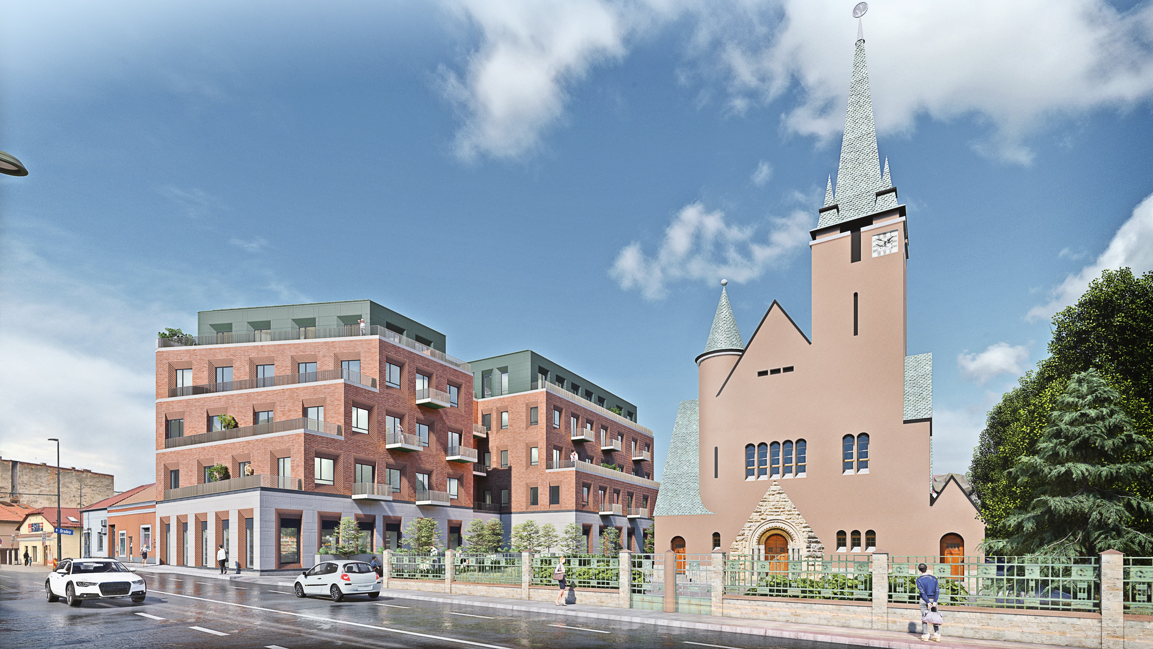 important preserve the existing geometry and the existing context exactly as provided do not modify alter reinterpret add remove scale or reshape any geometry do not change the site surroundings street layout neighboring buildings vegetation or context elements do not modify geometry scale proportions buildings road layout sidewalks or surrounding context in any way do not change text photorealistic architectural rendering clean and balanced contrast calm cinematic mood style contemporary european residential architecture minimalist premium understated include people and cars subtle motion blur for realism do not alter the church color soft late afternoon natural daylight warm and diffused sunlight coming from the upper left subtle long shadows realistic global illumination slightly hazy summer atmosphere soft ambientsubtle sky reflections in windows slightly reflective glazing with realistic fresnel effect soft motion blur on passing cars for realism light breeze feeling in vegetation natural green tones sunlit tree leaves casting soft dappled shadows photorealistic exterior visualization balanced exposure no harsh highlights no overblown whites slightly warm white balance realistic asphalt reflections with mild roughness physically accurate light behavior high dynamic range but controlled