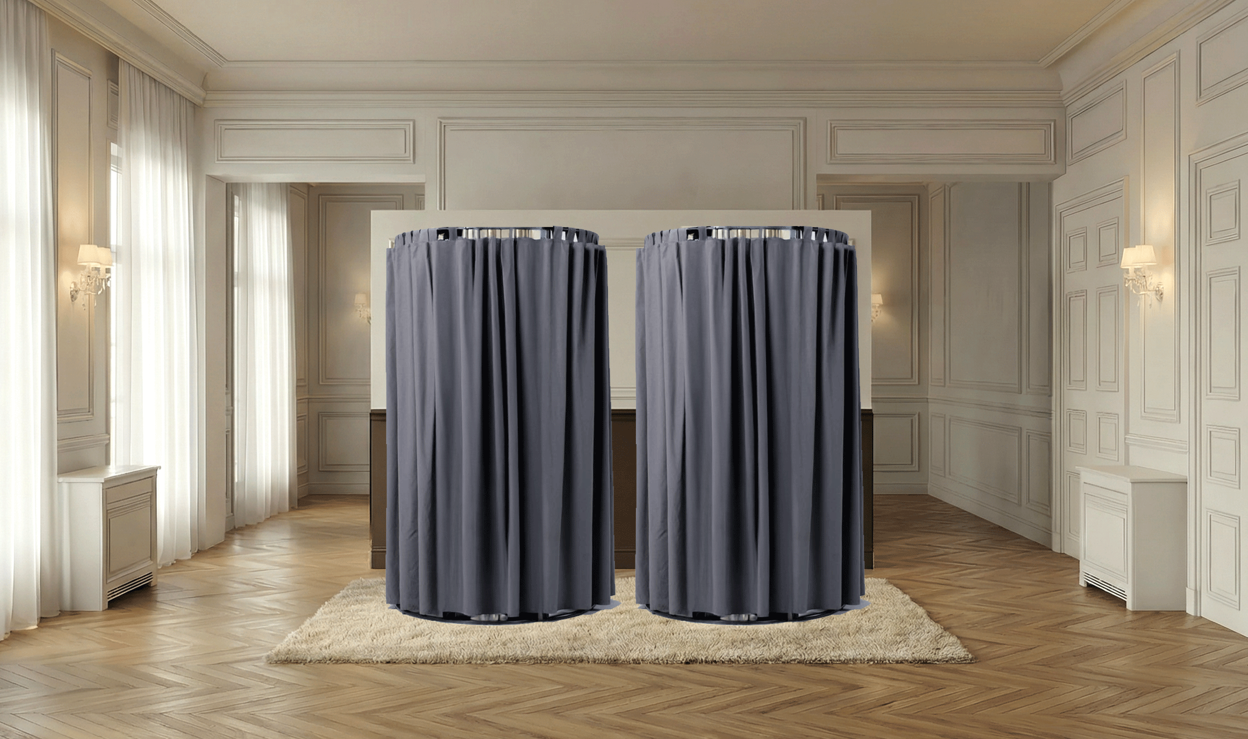 keep the entire background unchanged do not modify the room lighting or composition only enhance the central folding screen to be ultra photorealistic two clean cylindrical structures at the center wrap each cylinder with gray cotton fabric but keep the cylindrical shape clearly defined the fabric should follow the form not dominate it draping very light vertical folds minimal gathering evenly spaced calm and controlled avoid dense or heavy curtain like folds material thick cotton canvas matte gray tone subtle texture the top edge is clean and precise attached to a circular rail the bottom edge falls straight with slight natural irregularity lighting soft highlights following the cylindrical curvature with gentle shadow between folds overall feeling architectural restrained sculptural not decorative