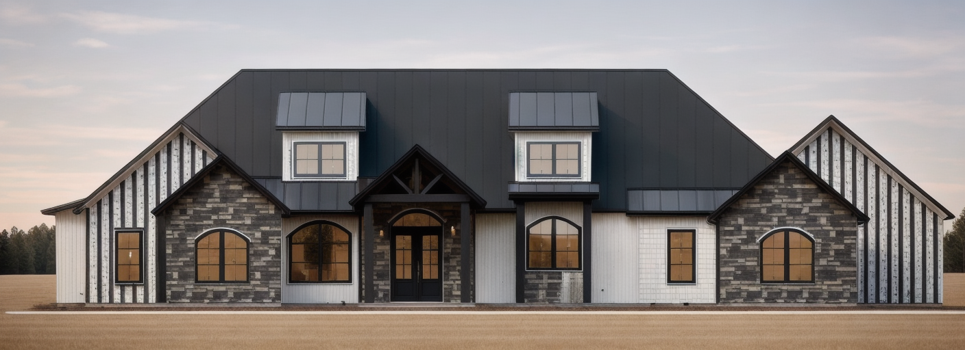 barndominium exterior shot exterior modern farmhouse with black roof black windows brown wood timbers dark brown horizontal siding cream stone white stucco and black vertical siding architecture