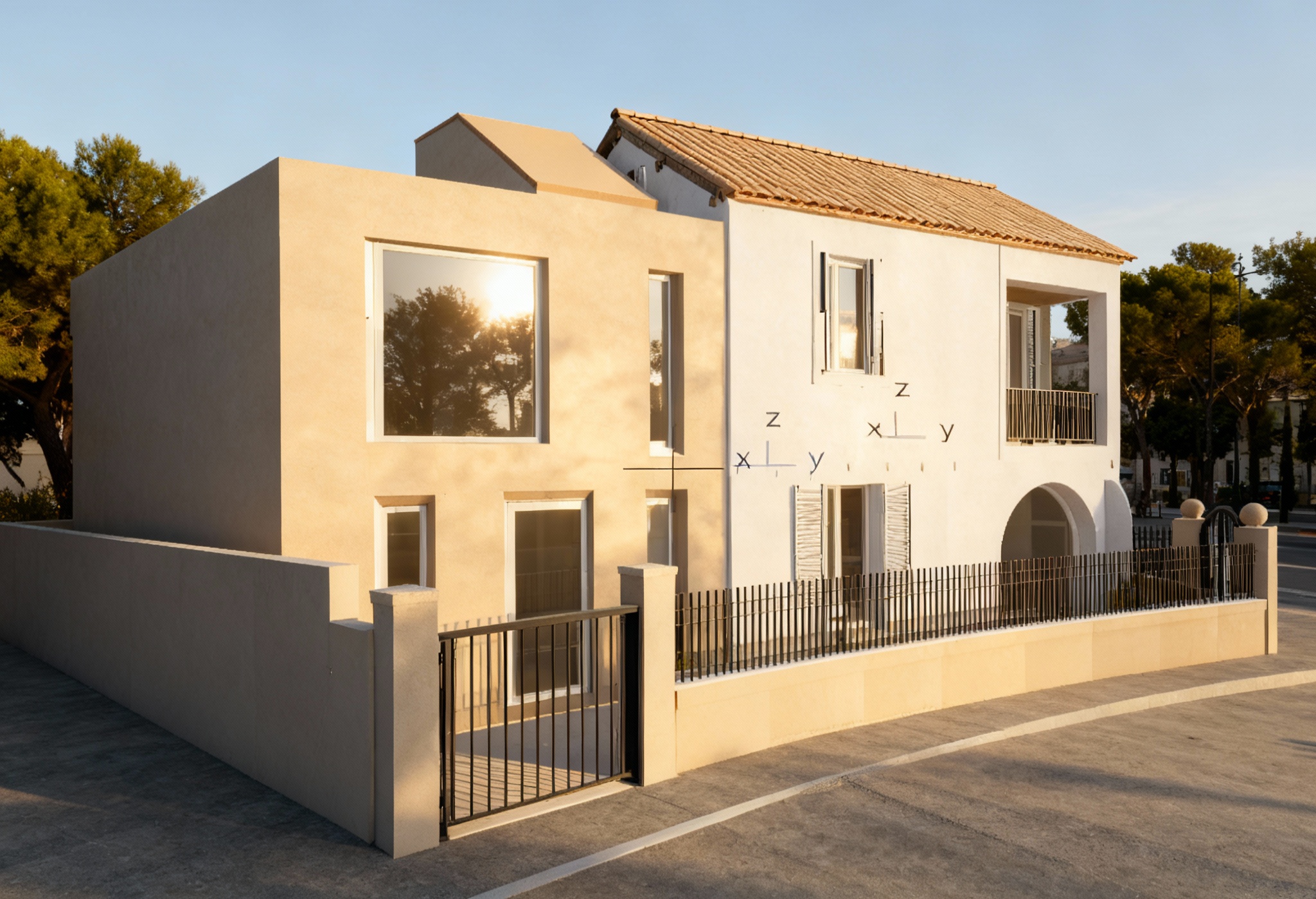 lot of reflects and sun light the sun illuminates the facade that one sees some trees and a street of marseille in the backgroung facade more in the light more reflect all is painted no stone