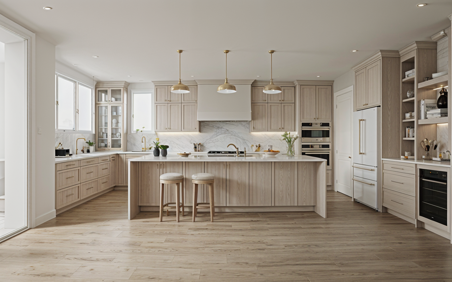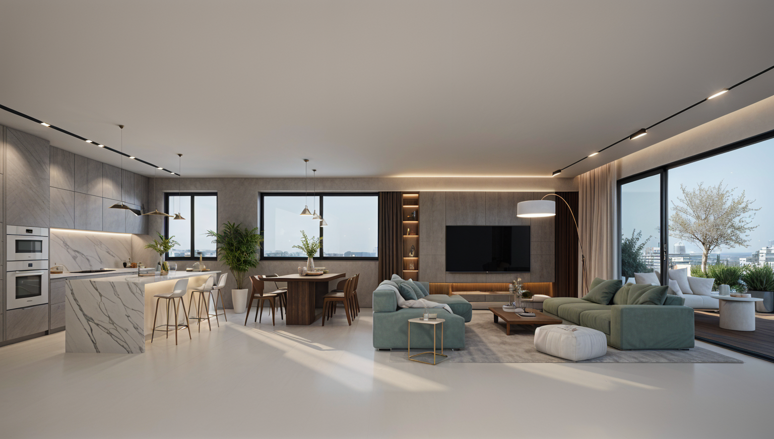 classical interior shot in the living room infront of the tv their is a coffee table in the kitchen the oven is black out side in the balcony the deck is made out of brown wood and the plants are green and flowery architecture