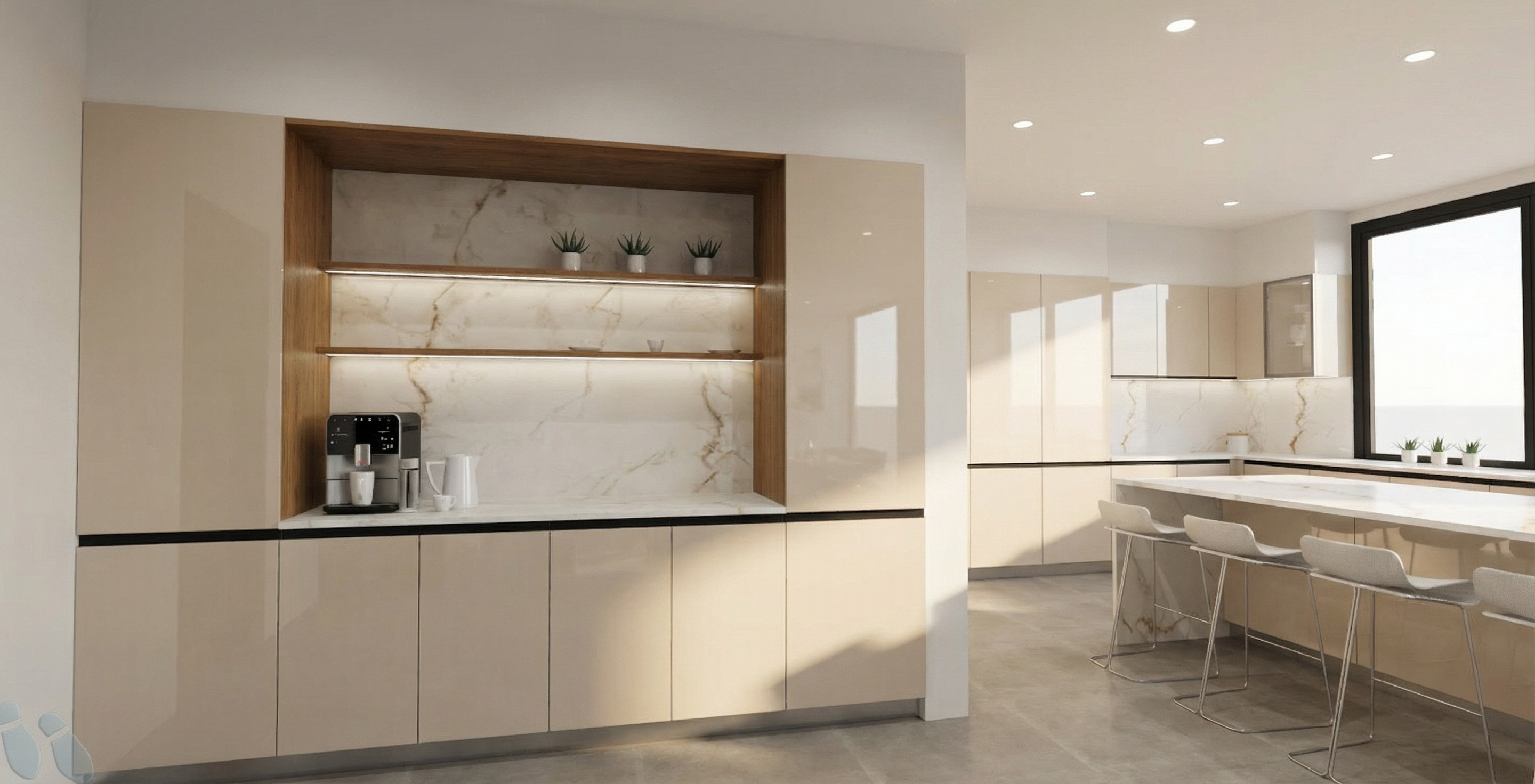 render a modern architectural building with a sleek horizontal design the building features light gray concrete walls and large reflective glass windows that shimmer in the sunlight the upper section of the building is clad in horizontal wooden panels with a warm natural oak finish the window frames are matte black providing contrast the atmosphere is serene and contemporary set against a clear blue sky with soft fluffy clouds add lush greenery around the base with well maintained hedges and small trees to enhance the building s modern aesthetic