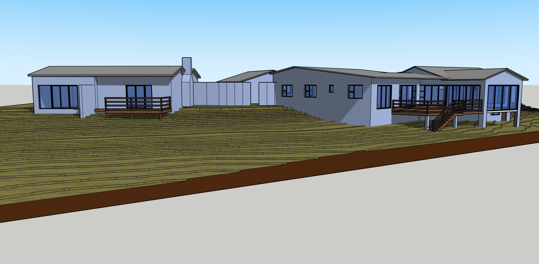 exterior shot no art on walls dark grey roof light grey walls architecture