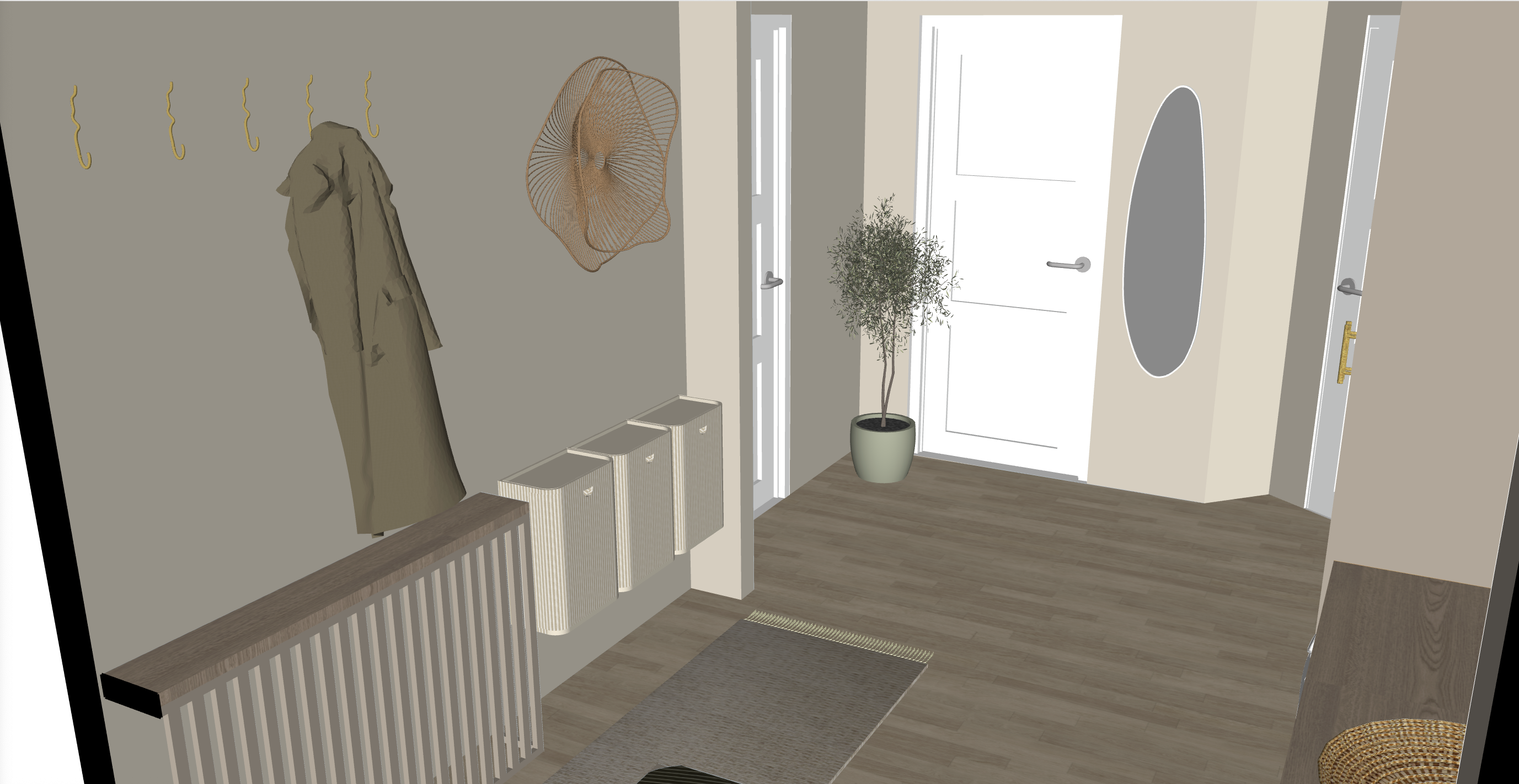 please make a realistic render of this entrance hall during the day and turn on the lights in the round wall lamp