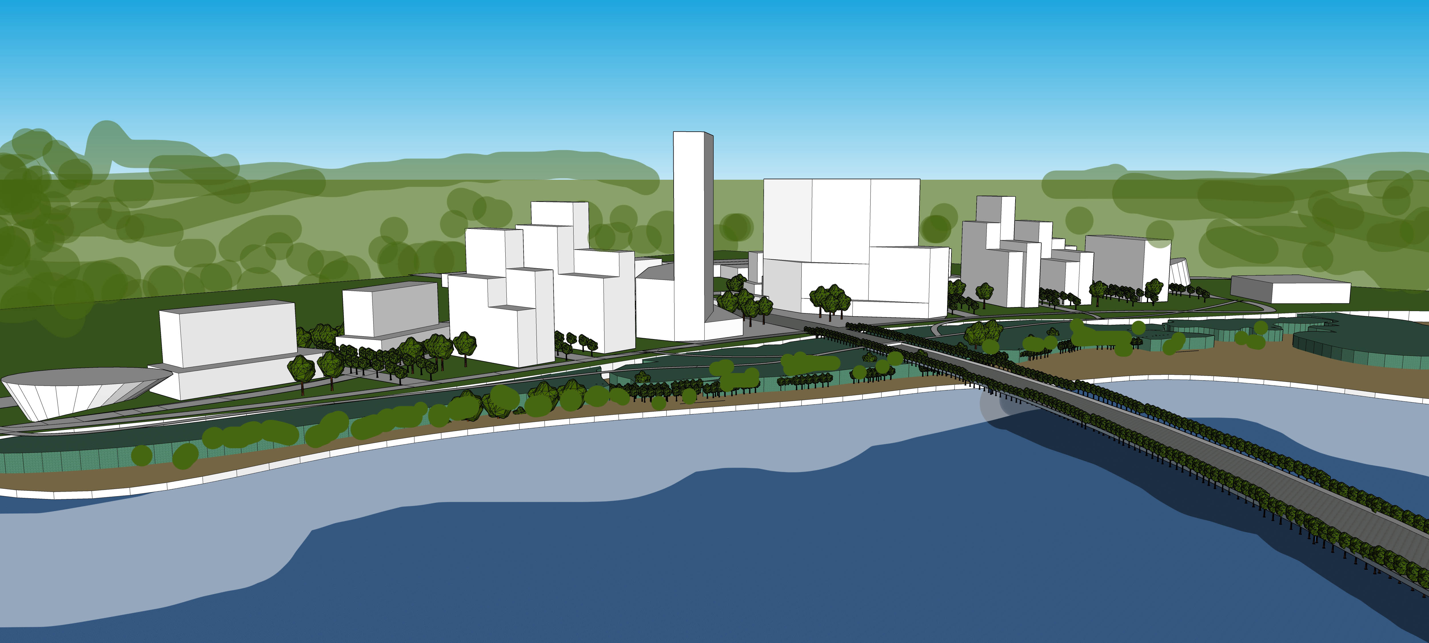 this is a sea front of a modern city like dubai in tropical country the buildings are mostrly made of glas between the buildings and the sea there are manglares with a lot of wooden floating pathways