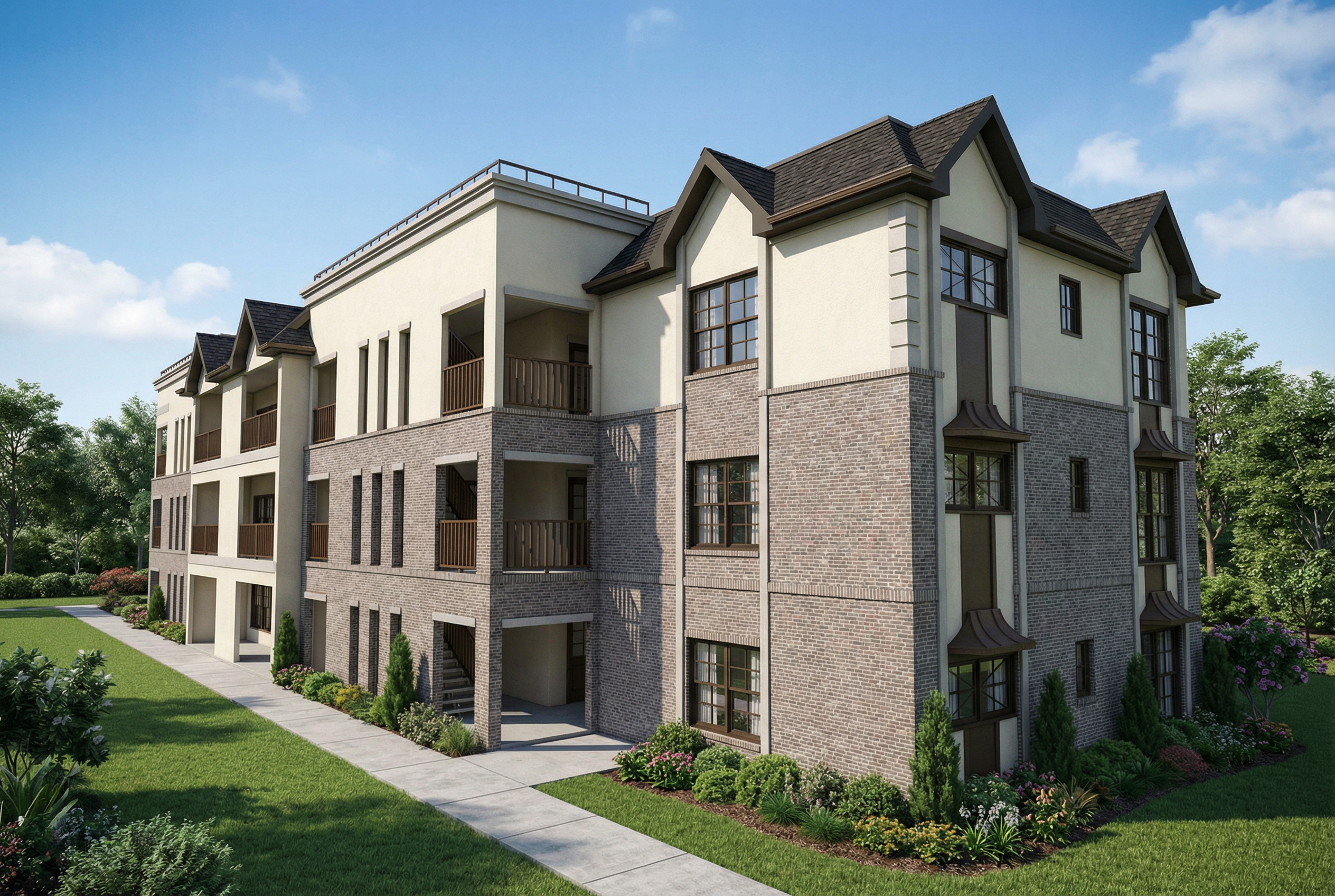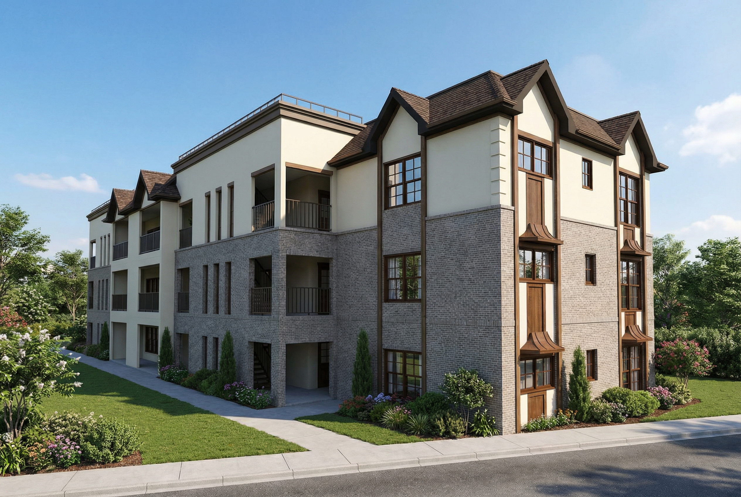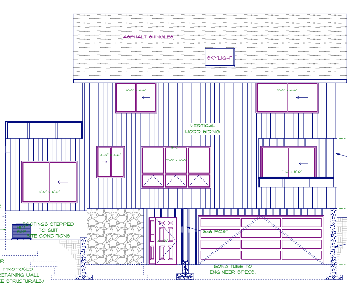 render a modern two story house with clean lines and a minimalist aesthetic the exterior features vertical wood siding in a black color contrasting with a dark gray asphalt shingle roof add a sleek skylight integrated into the roof the large windows have black frames enhancing the modern look incorporate a rustic stone facade around the main entrance using a mix of light and dark gray stones the garage door is sleek and modern painted a matte charcoal gray use lush greenery around the base of the house to add a natural touch set this scene in a serene overcast atmosphere with soft diffused lighting for a calm and inviting feel