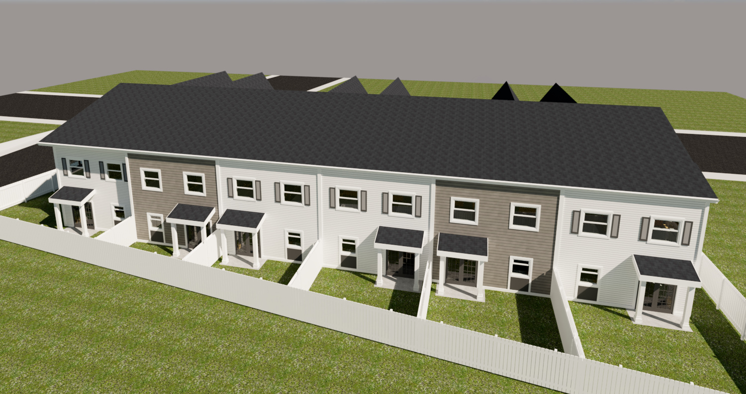lock the geometry and pixels of the integrity of the building enhance the quality of the materials and colors add single family homes in the horizon add tennis courts and small trees at the bottom of the image make the whole image photorealistic do not change the materials that are shown