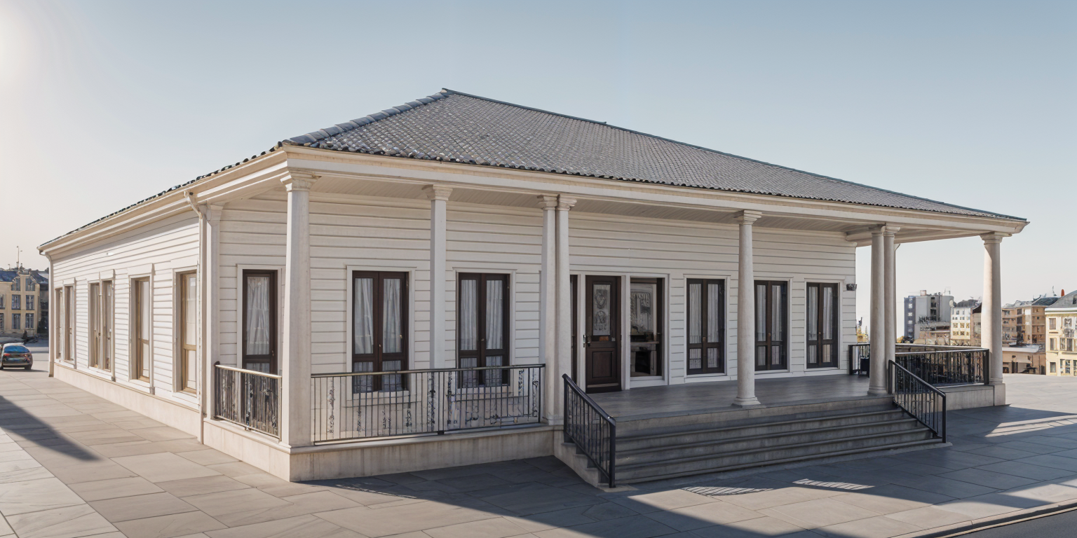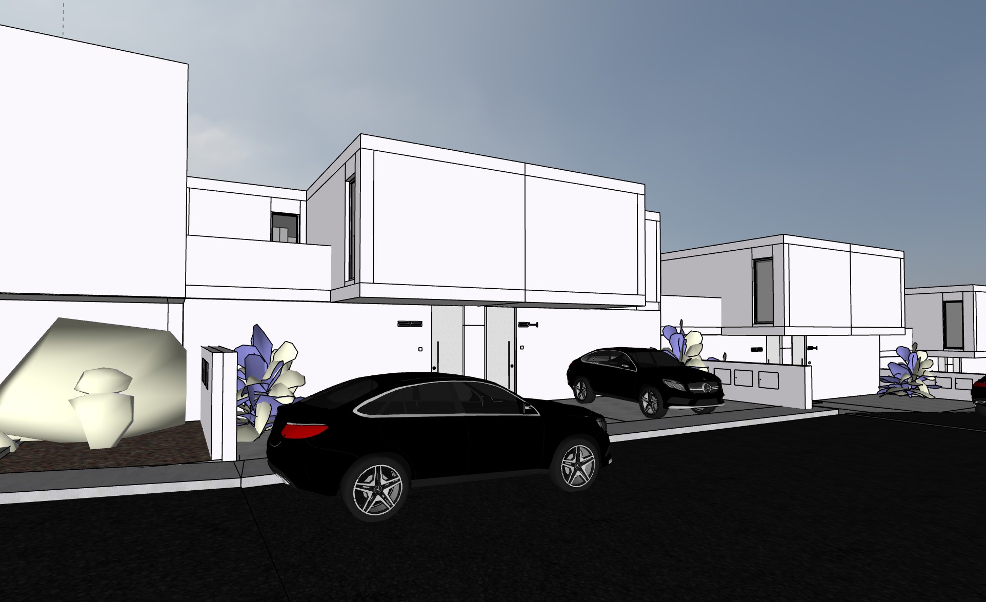 exterior shot render a modern residential street scene with a minimalist architectural style buildings are sleek and white with sharp lines and large windows add lush green foliage and vibrant purple and blue plants along the pathways the cars are glossy black with metallic highlights parked on a smooth dark gray asphalt soft ambient lighting creates a serene atmosphere with a sky transitioning from subtle shades of lilac to dusky blue capturing a tranquil late afternoon vibe