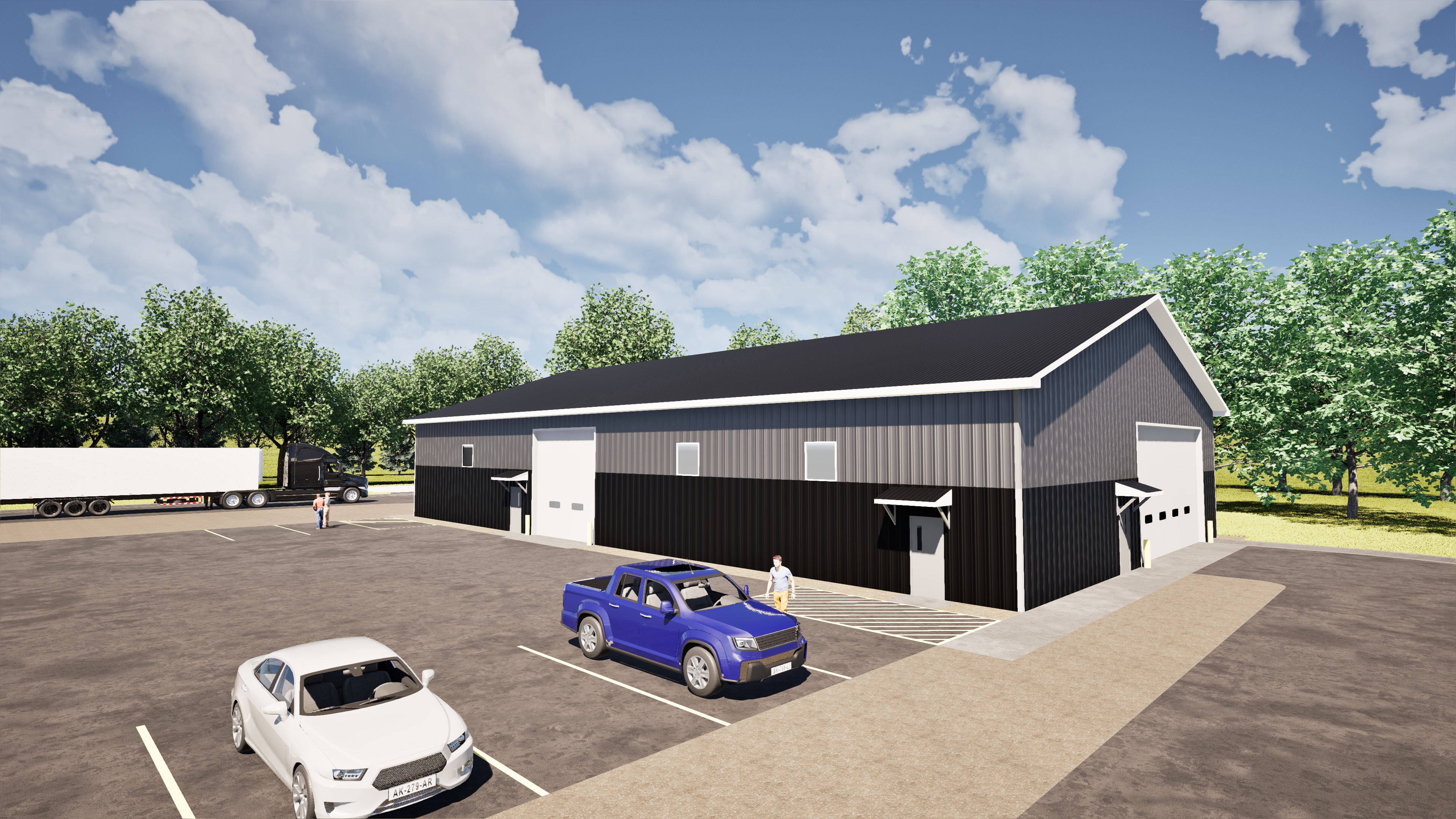 use the uploaded rendering as the base image and the uploaded logo file as the exact artwork to add edit the rendering in only one way place the logo on the building as signage in exactly two locations using the right side of the building as viewed in the image location 1 place one logo centered horizontally above the man door on the right side of the building location 2 place one logo centered in the gable end of the far right side of the building use the logo exactly as provided with the same colors proportions and transparency background treatment from the uploaded logo file do not redesign simplify restyle recolor crop stretch or reinterpret the logo mount each logo naturally to the building surface with accurate perspective scale lighting and shadows so it looks like realistic building signage do not change any other detail in the rendering change nothing except adding those two logo placements preserve the image exactly otherwise same building design same materials same colors same doors trim roof windows pavement landscaping sky shadows lighting reflections camera angle framing background people and all other architectural or scene details do not retouch clean up enhance add remove move or modify anything else in any way output a single edited image with only those two added signs and zero other changes