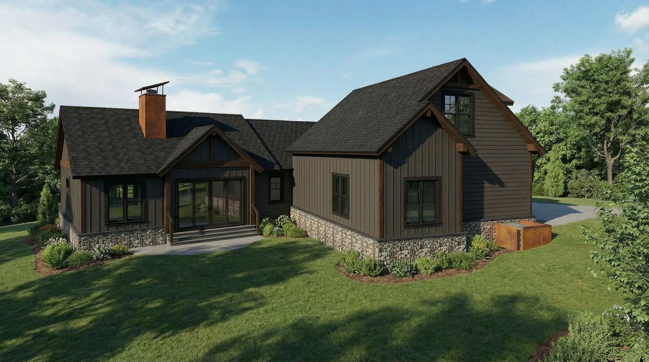 black roof daker warm grey siding and paneling with stone work along the bottom following the land simple landscaping the door leads to the garage