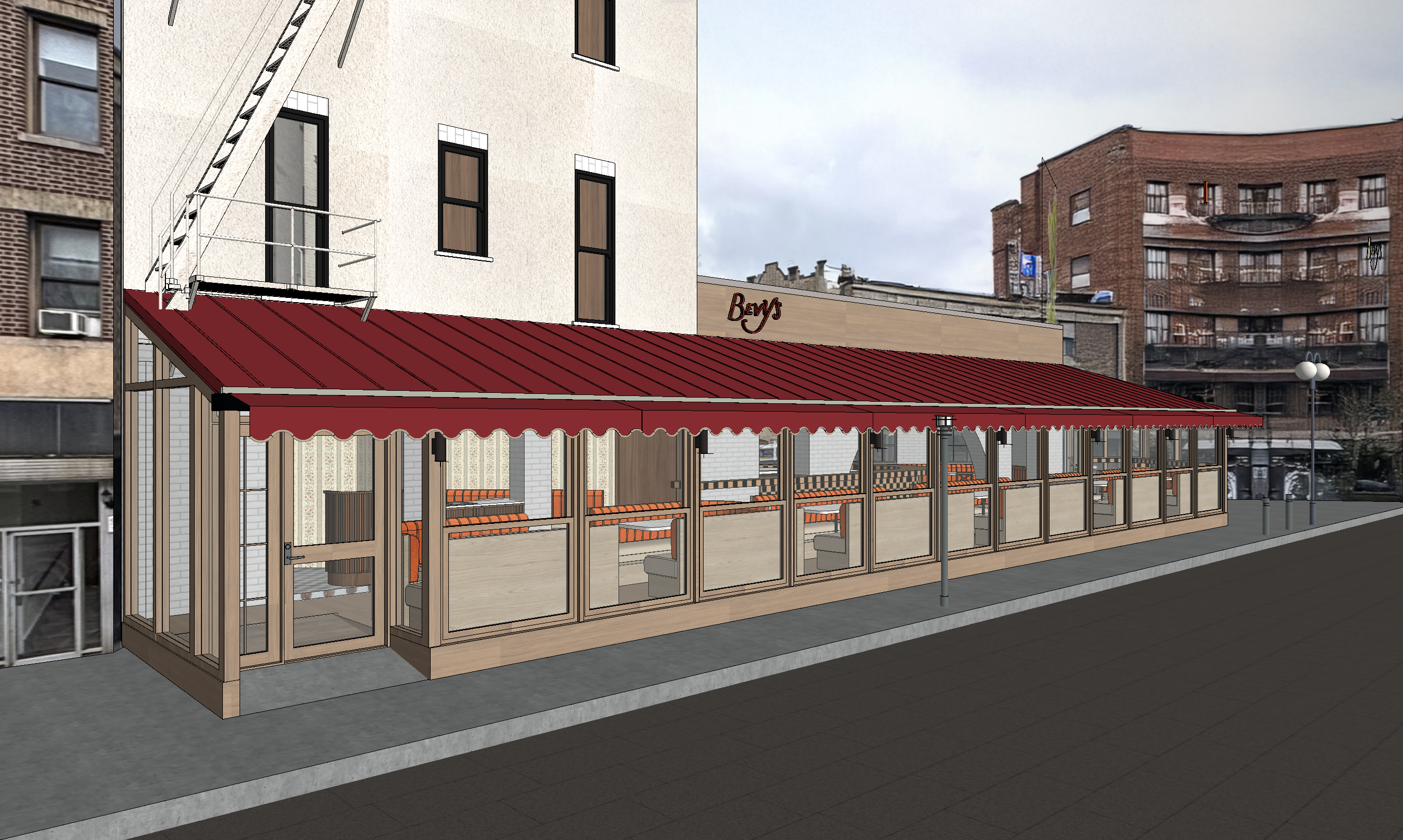 ultra photorealistic daytime exterior render of the bevy s restaurant in new york preserving the exact architectural proportions and layout of the model a deep maroon standing seam metal roof with rich matte saturation and realistic daylight sheen paired with a matching maroon fabric awning featuring a clearly visible beige scalloped piping along the lower edge a long glass storefront constructed from light oak wood frames with natural grain detail including light oak mullions transoms and base panels the interior visible through the glazing showing orange channel stitched banquettes and patterned flooring subtle fa ade window line spotlights mounted on the wooden frame and the bevy s sign rendered as a thin continuous red neon tube precisely following the handwritten outline of each letter bright glowing and creating a soft red ambient halo similar to the reference neon image the entire scene is illuminated by clear midday sunlight with crisp shadows realistic highlights and reflections on the glass high resolution texture reproduction for wood neon metal and fabric and a typical new york brick building backdrop under bright daylight