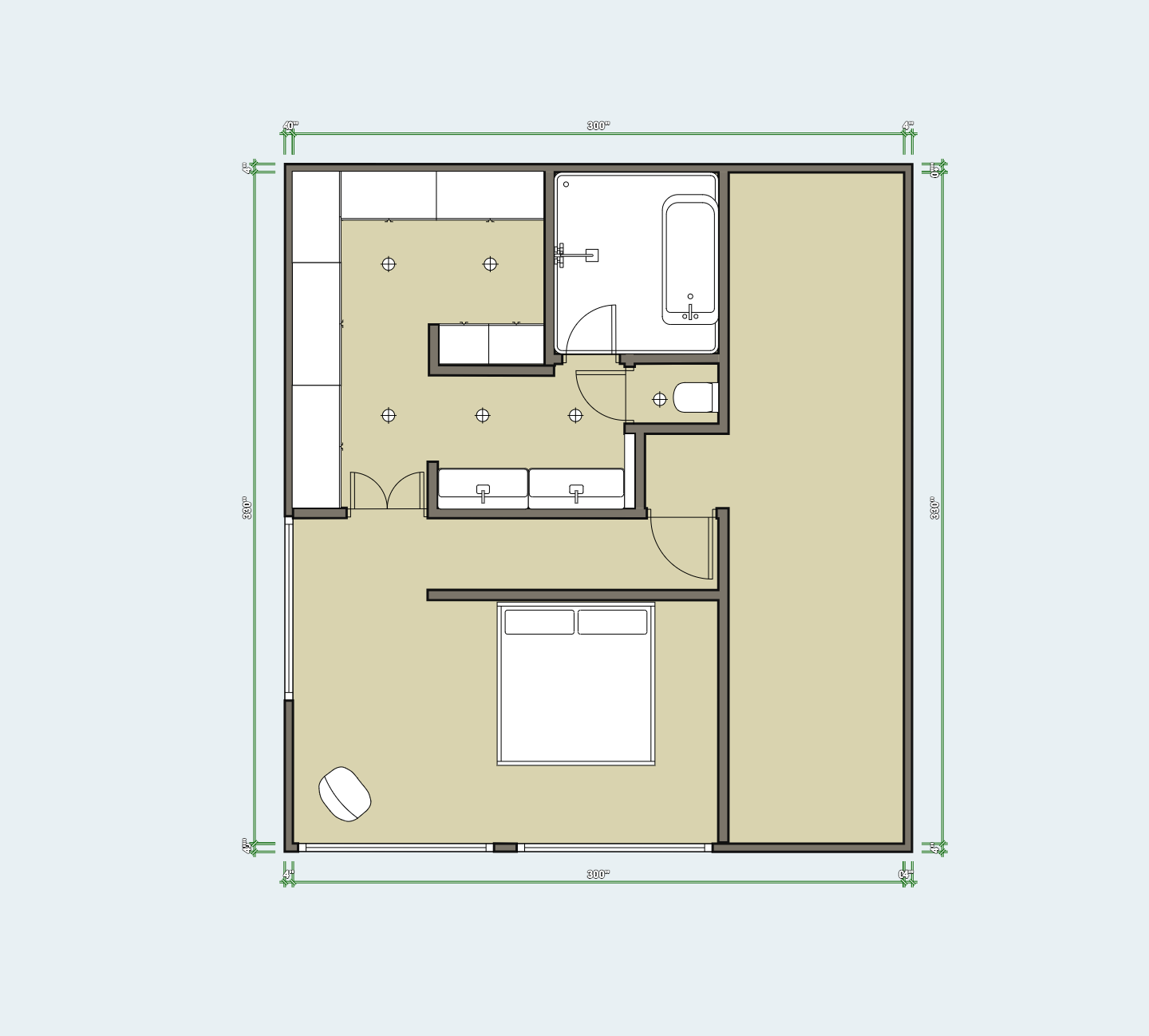 convert this floor plan into a architectural isometric 3d view of a bedroom show the space from an elevated angle with furniture walls and details visible use the same furniture as shows on the plan do not change the orientation of the floorplan