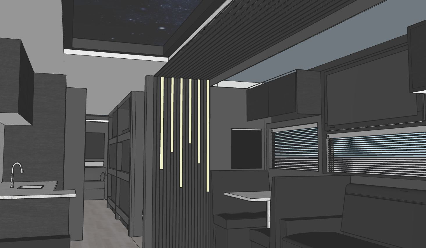 please follow the coloring black cabinetry with accents and dark grey walls this is insidea tour bus