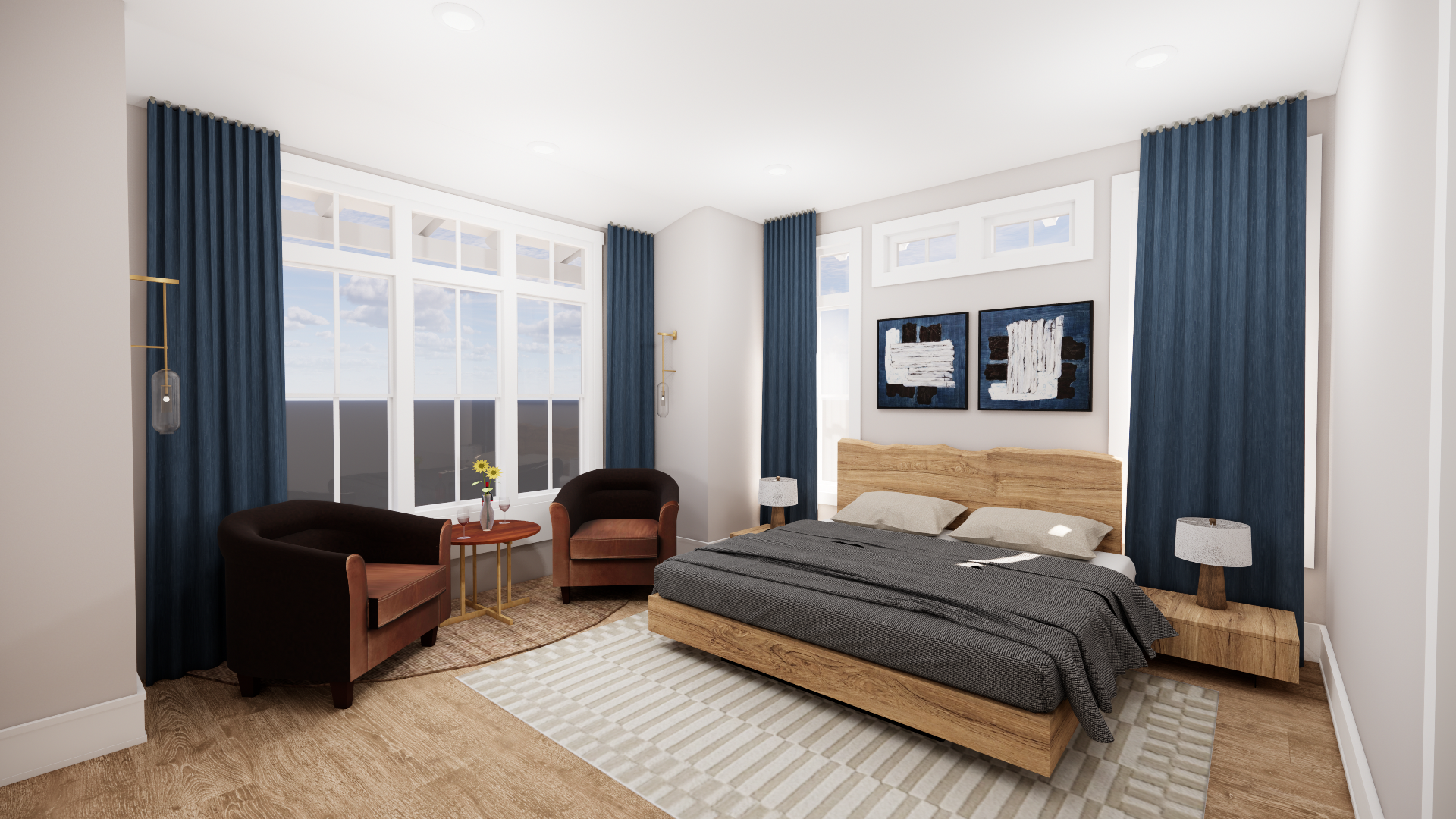 you are a professional image renderer you create the highest grade renderings around and specialize in architectural renderings this is an interior rendering of a third floor bedroom in a beach house create a high resolution photorealistic image of this room keep the windows as they are where they are keep the doors as they are where they are keep the main structure as it is where it is feel free to change the perspective keep the roofline as it is where is it do not add anything to the structure that i have not asked for the view outside the windows is a sandy coastline it should be early afternoon with a bright sunny day clear skies