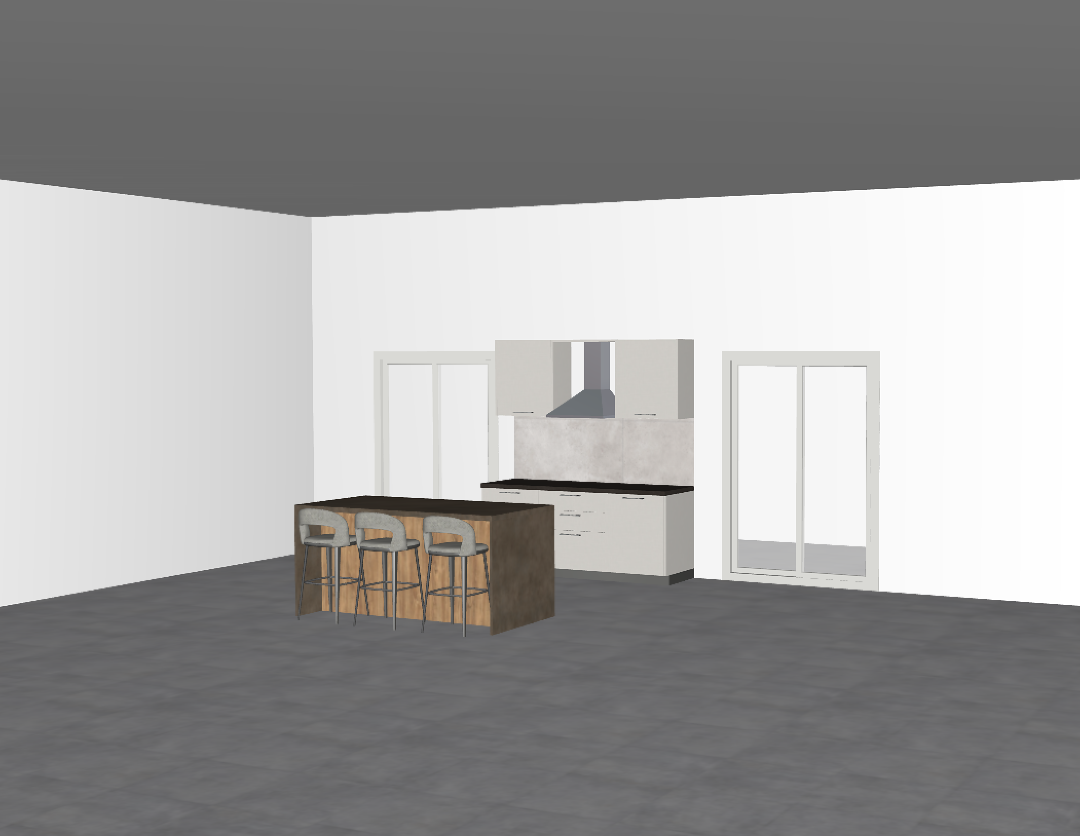 a modern kitchen interior with a sleek and minimalist design the room features white walls and gabled wooden roof creating a smooth contrast the floor is covered in large polished gray tiles a central island with a rich brown wooden base and black countertop paired with three elegant bar stools in light gray fabric with metal legs the kitchen cabinets are an elegant beige with stainless steel handles underlined by a glossy black countertop a large window with white frames invites natural light casting a warm and cozy atmosphere use soft warm lighting to enhance the inviting ambiance