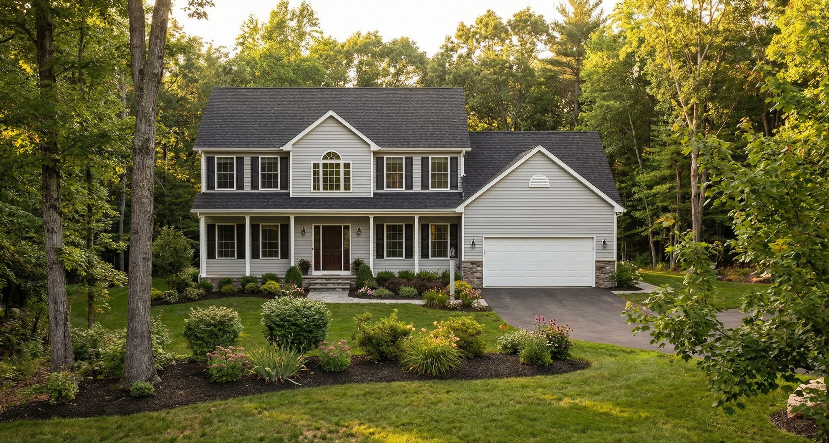 photorealistic rear elevation render of a uk semi detached house based exactly on the provided architectural drawing maintain exact proportions rooflines window positions and massing from the drawing do not redesign the house ground floor single storey rear flat roof extension with smooth white silicone render finish no brick plinth only a thin dark dpc line at base level large anthracite grey aluminium sliding doors centred one smaller anthracite grey aluminium window to the left no additional rear doors first floor flat roof rear dormer clad in horizontal light timber cladding anthracite grey aluminium windows central juliet balcony with frameless glass balustrade and anthracite grey double doors roof existing pitched roof finished in plain clay tiles flat roof finished in dark grey membrane details white fascia and soffits black rainwater goods clean architectural lines remove all text dimensions arrows red boundary lines and notes from the drawing do not include annotations realistic british daylight professional architectural visualisation neutral garden setting with simple patio paving