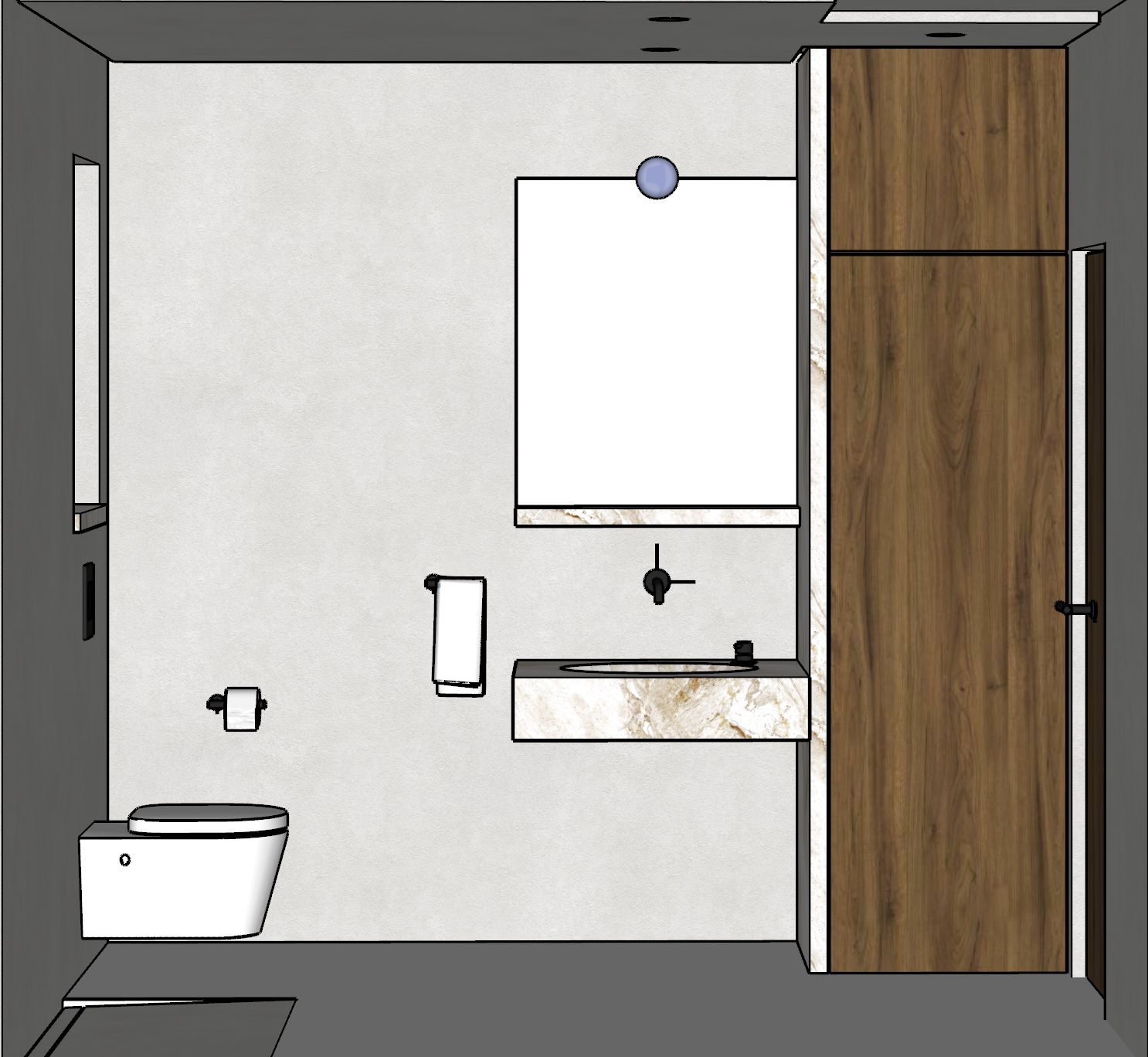 photorealistic image minimalistic bathroom walls and floor from light beige microcement washbasin from marble cabinet from natural oak veneer