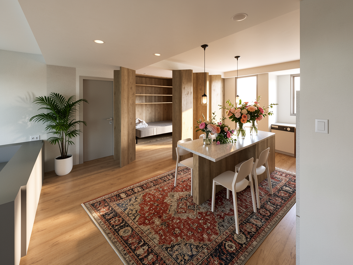 create photorealistic view building color is off wihite ral9010 facade material is plaster