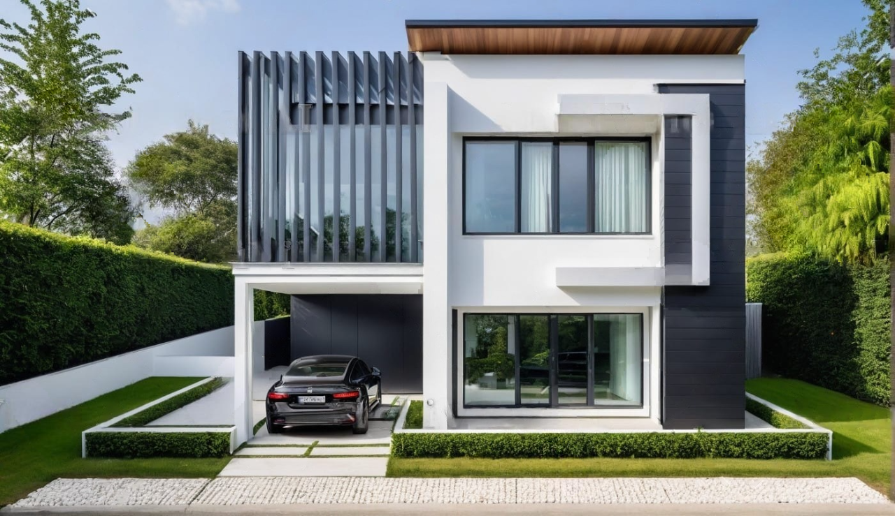 exterior shot exterior modern elevation with portico and balcony with pergola and rails