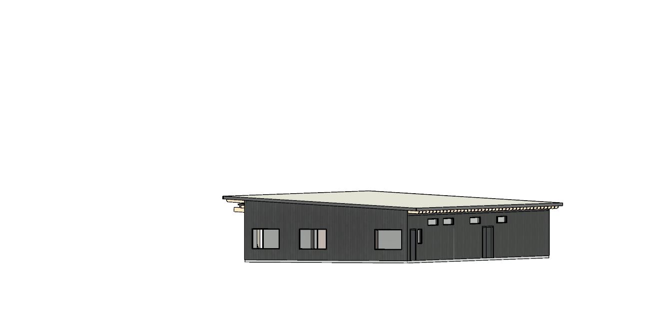 the building has am asphault area with few parking spots behind it and a curbed landscape area to the left behind it is a pine tree forest in front of the building is a small hill where a two lane road is