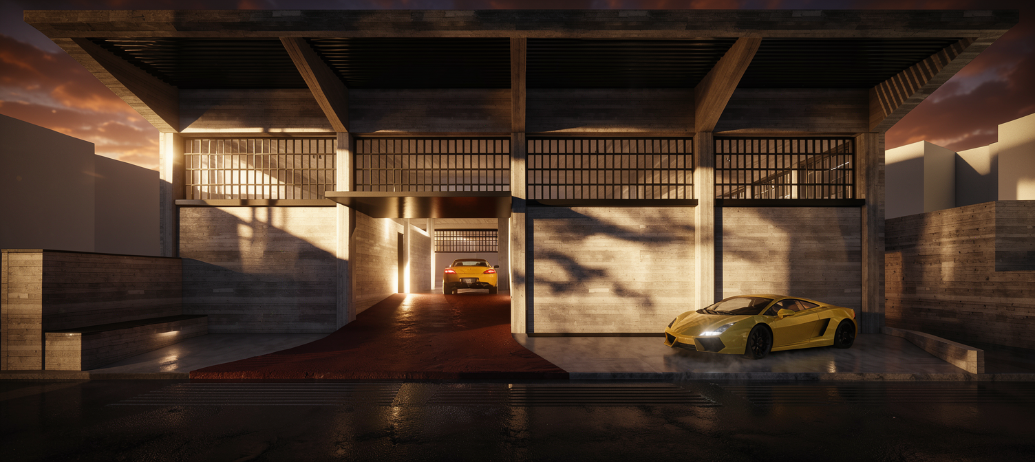 exterior shot overlay the white building from the original image with the one from the moodboard