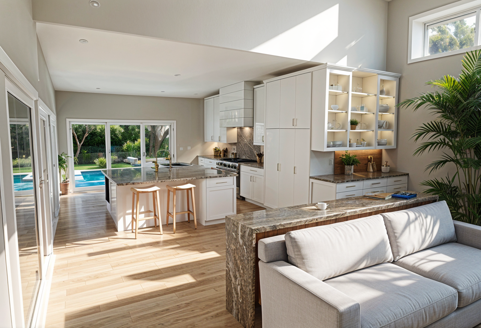 improve the realism of the interior render while keeping the exact layout camera angle proportions and furniture placement unchanged enhance material quality and depth make wood surfaces more realistic with visible natural grain subtle variation and matte finish improve stone and solid surfaces with soft reflections and micro texture add realistic fabric texture to upholstery soft slightly imperfect lighting create a natural daylight atmosphere with soft shadows and balanced contrast add warm led lighting 3000k in key areas shelves niches under cabinets behind panels improve light diffusion and eliminate flat lighting details increase contrast depth and shadow layering for a premium architectural visualization add subtle imperfections to avoid overly perfect cgi look enhance reflections on glass and metal surfaces but keep them realistic not glossy keep the space elegant minimal warm and highly realistic do not change layout furniture materials concept or composition perfect but please the wood is dark walnutcabinet doors in dark walnut wood warm rich tone with elegant framed panel detailing subtle profiling matte finish visible natural wood grain