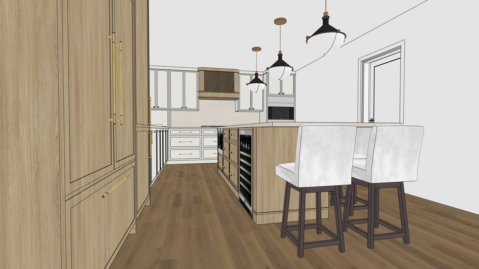 ultra realistic interior kitchen rendering shown from a wide angle perspective looking down the main circulation aisle with a clear view of the tall pantry cabinetry on the left the island with integrated storage and seating on the right and the cooking wall in the background the kitchen features a consistent combination of light natural oak wood cabinetry and soft white shaker style cabinetry using the exact same light oak wood tone established in the first kitchen prompt the wood finish is a warm light oak with subtle natural grain matte and low sheen reading clean and refined not yellow not gray and not rustic ensuring full material continuity across all views on the left side of the image a full height floor to ceiling pantry cabinet wall is finished in this same light oak wood tone with integrated doors recessed panel detailing and brushed brass bar pulls creating a strong vertical plane along the circulation path at the center of the space a large rectangular kitchen island runs lengthwise the island base is finished in the same light oak wood tone and the countertop is a thick solid off white surface with a smooth matte appearance and minimal veining the island includes integrated storage drawers and cabinets as well as a built in wine fridge on the aisle facing side along the far wall white shaker style cabinetry with clean recessed panels and slim brushed brass hardware frames the cooking area a cooktop is centered on the back wall beneath a wood clad range hood surround finished in the same light oak tone for visual continuity to the right a stacked built in wall oven and microwave are integrated flush into the white cabinetry on the seating side of the island upholstered counter stools with white fabric seats simple backs and dark wood legs are aligned neatly maintaining consistent spacing and scale above the island three pendant lights are suspended in a straight line each fixture features a black metal shade with a white glass diffuser and brass detailing hung from slender rods evenly spaced and centered over the island the flooring throughout the kitchen is medium tone natural wood planks laid lengthwise with visible grain that complements the light oak cabinetry without overpowering it lighting is soft even and neutral consistent with architectural visualization standards the overall aesthetic reflects a sketchup style architectural 3d render characterized by clean outlines simplified geometry crisp edges and flat yet realistic materials maintaining accurate proportions and a calm uncluttered composition no elements are added or altered the image remains fully faithful to the original scene and material consistent with the other harris kitchen views