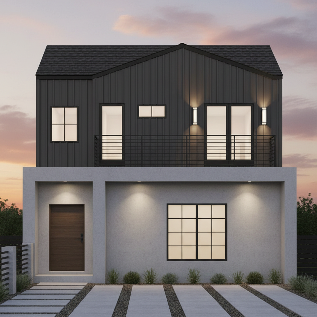 a charming country house with a light gray exterior featuring crisp white trim and accents the roof is gunmetal slate adding a modern touch the front porch is adorned with natural wood railing complementing the house s structure the front door is a welcoming rich oak color suggesting warmth and hospitality surrounding the house imagine a lush green lawn with vibrant wildflowers in various shades of purple yellow and pink the atmosphere is serene and inviting with a gentle sunlight filtering through scattered clouds in a light blue sky