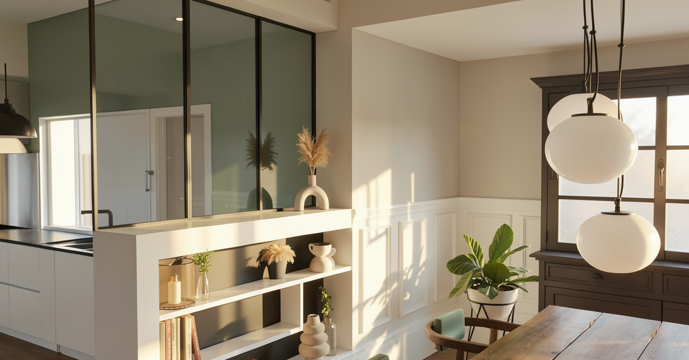 light and modern decoration in an old appartment bring some light and life into the eating room there is another room at the back with a wide window