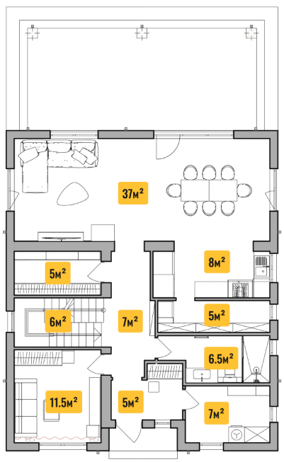 top view add furniture remove sizes and yellow blocks change right down small room into a boiler room change left middle small room into a wardrope change small room under kitchen into a pantry