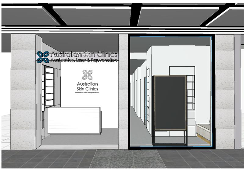 a modern skin clinic entrance with a sleek minimalist design the exterior walls are textured in soft concrete tiles with subtle stone accents the reception area inside is clean and inviting featuring a white desk and light grey flooring with people inside the large glass window offers a glimpse into the well organized space beyond with hallways lit in warm downlights the signage is elegant in dark teal and silver tones reflecting sophistication and calm illuminated from behind like a halo the overall atmosphere is serene professional and welcoming with a touch of luxury and the space is located inside a shopping mall so soft lighting should reflect this