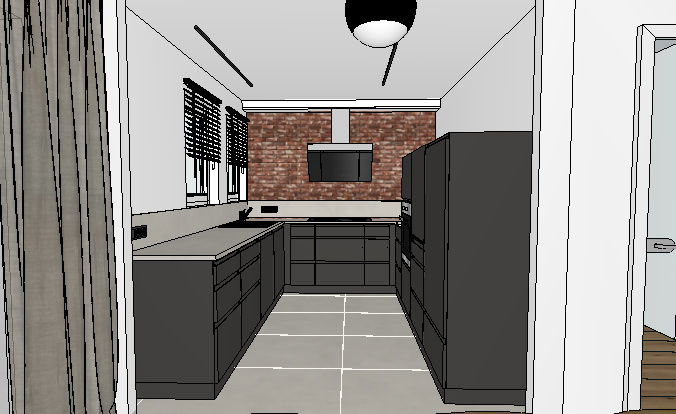 worktop is same ccolour than floor tile curtain has linen structure and is lighter