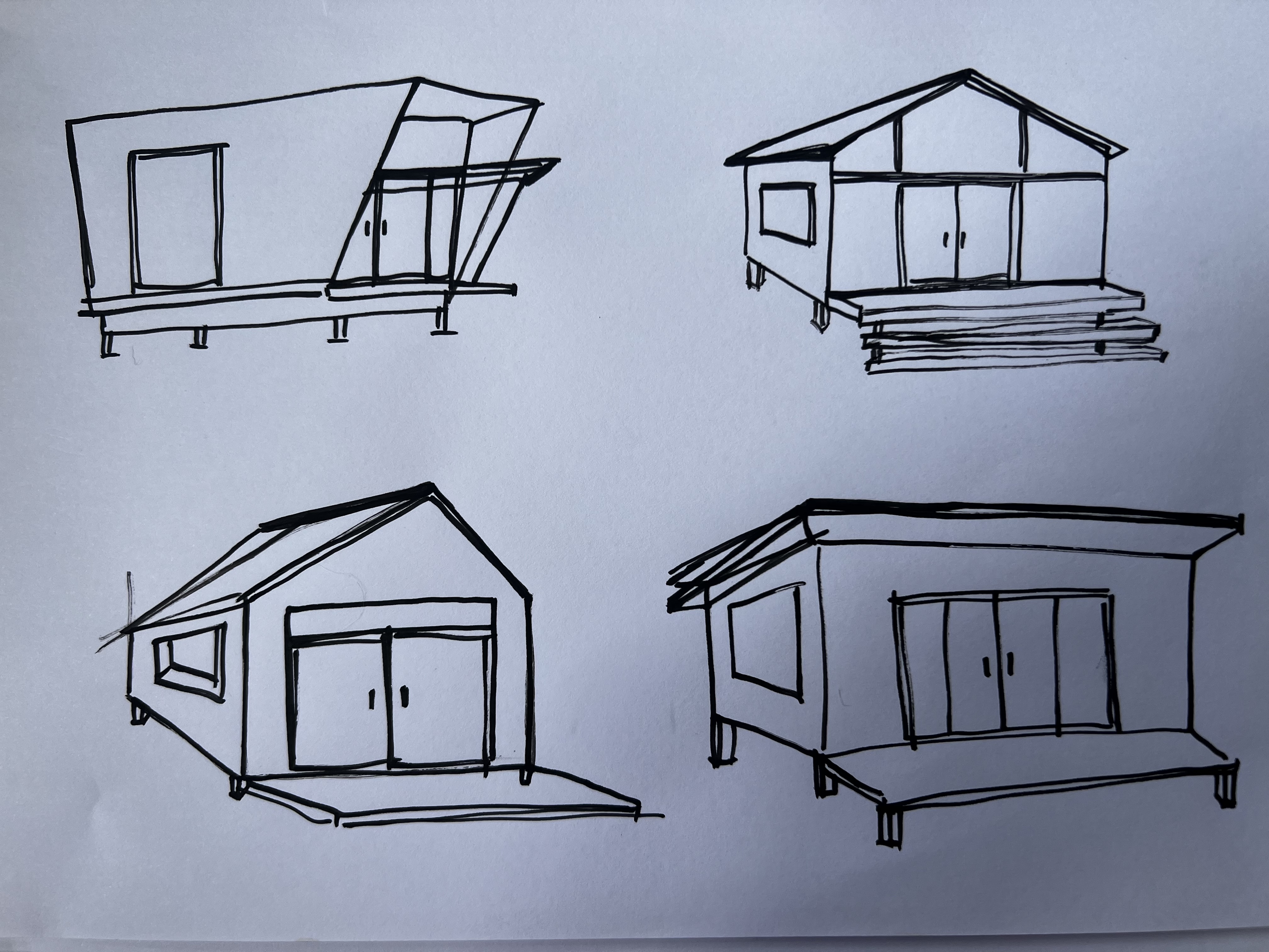 keep as 4 massing sketches please refine all keep black and white but refine linework