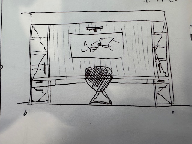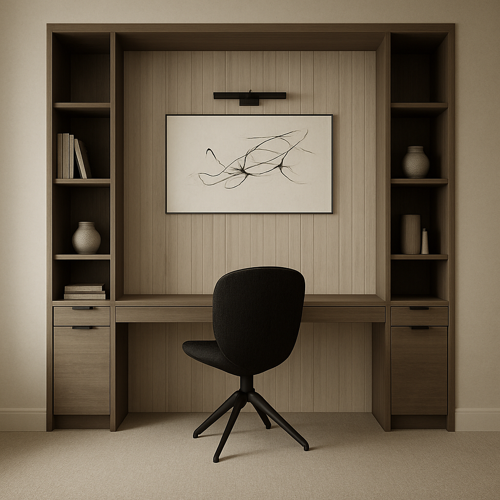 make all cabinetry bench and vertical wall panelling in a charcoal colour add office decor to suit change glass cabinets to cabinet fronts