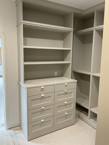 do not change the cabinets in any way preserve the exact cabinet colors materials finishes dimensions door and drawer styles hardware spacing alignment and all geometry exactly as shown do not alter the countertop shape backsplash appliances flooring lighting fixtures or wall structure only remove the construction materials clutter and mess from the scene clean the room and make it look finished and staged add a few simple tasteful home accessories appropriate for the style of the space but do not add or remove any furniture windows or architectural elements maintain the original lighting direction and realism enhance clarity and polish the photo while keeping the cabinetry and room design completely unchanged do not alter the lighting to keep the cabinet colors as they are in the image add carpet add brushed nickel cabinet pulls to the door and drawer fronts stage for a luxurious closet do not change or expand the photo at all keep the angle as is do not change the cabinets at all
