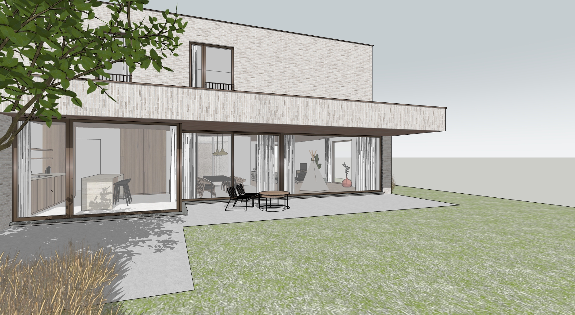 ultra realistic architectural exterior render of a modern residential house the fa ade is made of camargue carrera facing bricks from heylen ceramics with realistic texture subtle color variation and natural mortar joints directly above the windows the fa ade bricks are laid in a rotated bond with the bricks oriented vertically instead of horizontally clearly visible and accurately detailed aluminium window frames in supranodic collection bronze with realistic reflections and glass the front fa ade features vertical afromosia wood slats with warm tones and visible natural wood grain an audi a3 is parked on a driveway made of simple grey gravel natural landscape surroundings neutral environment soft daylight realistic shadows photorealistic high detail architectural visualization