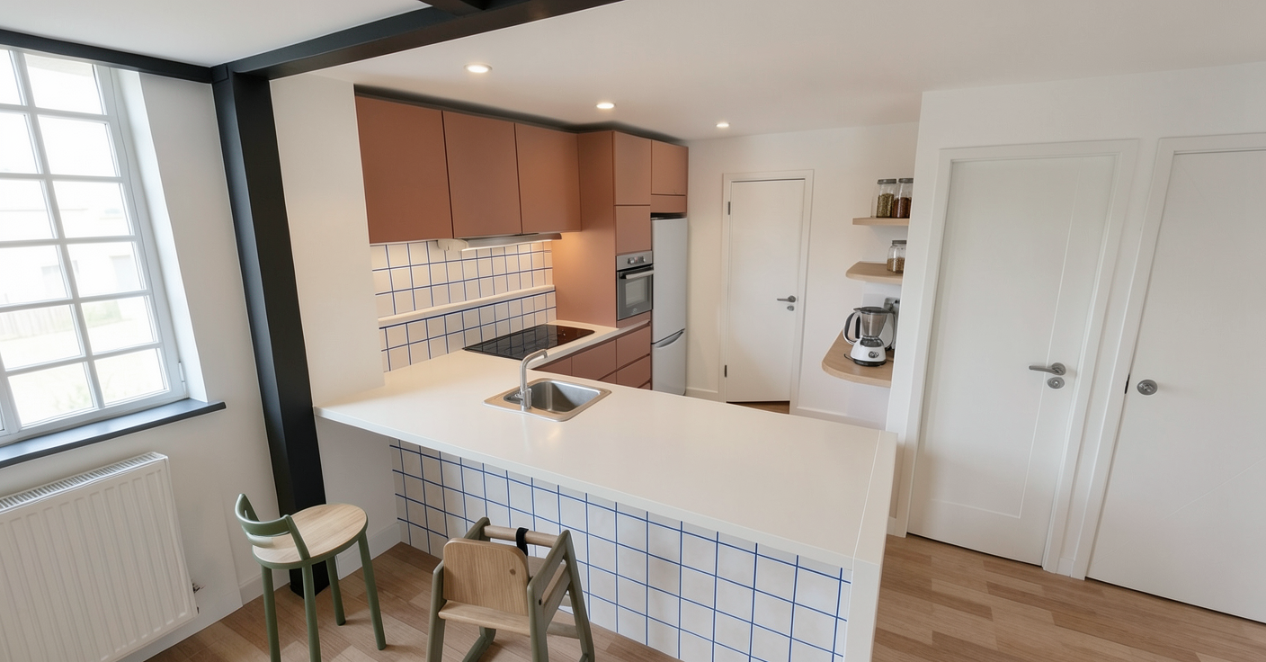 prompt a modern two story house design with a rustic charm the roof is clad in rich terracotta shingles providing a warm inviting feel the upper walls of the house are painted in a muted olive green adding a touch of elegance and blending harmoniously with nature large sophisticated windows with white frames enhance the fa ade drawing in natural light the lower walls feature a classic brick pattern in a soft beige transitioning seamlessly into the deep mahogany wooden garage doors beneath a clean modern railing runs along the side deck painted in a sleek black the overall atmosphere is tranquil and inviting set in a serene neighborhood captured in soft natural daylight color palette terracotta olive green white beige mahogany black