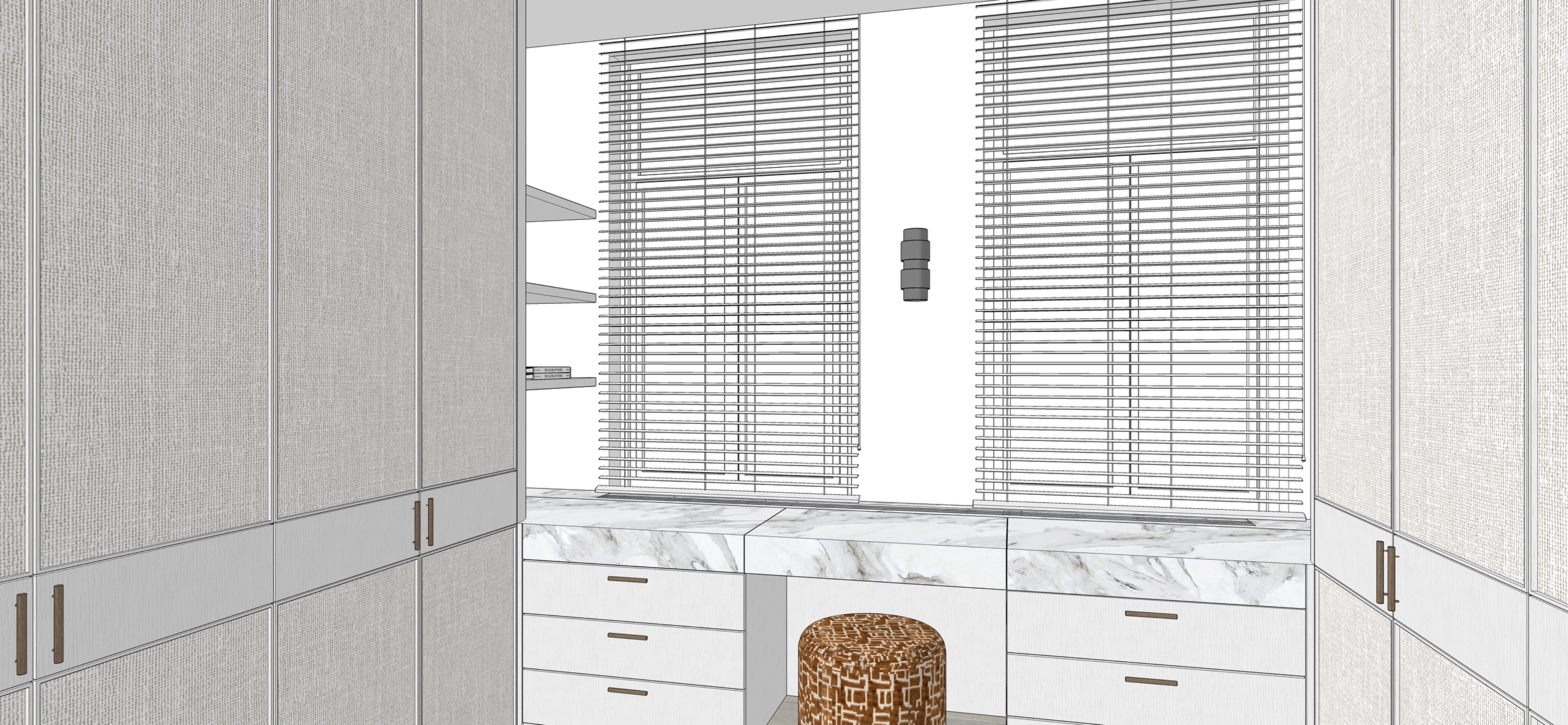 create a photorealistic render of this exact dressing room view with the same camera angle composition and layout as the reference image do not add remove or change any furniture cabinetry shelving lighting fixtures openings or architectural elements the built in wardrobes are finished in light textured fabric or linen look panels with subtle vertical white stained oak divisions and walnut handles and the lower cabinets and drawers are finished in a white stained oak the countertop below the windows is finished in light marble with soft grey and gold calacatta gold veining and the floor remains light wood and calm in tone as shown all existing interior lighting is switched on at warm 2700k and remains exactly as placed without adding any new lighting soft natural daylight enters through the two windows and shows a realistic garden view from the first floor of a villa with greenery layered planting and soft depth without harsh contrast or dramatic lighting while materials must show refined texture depth and a calm high end residential atmosphere