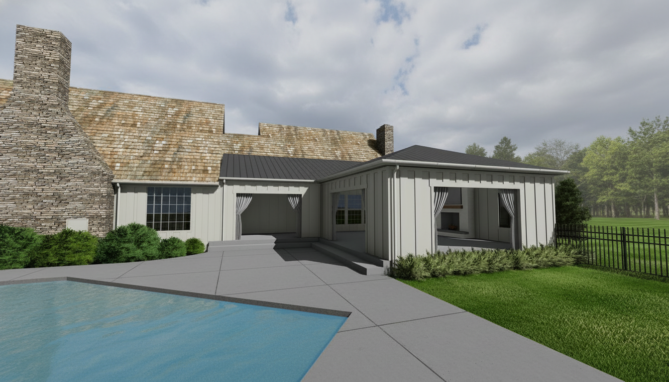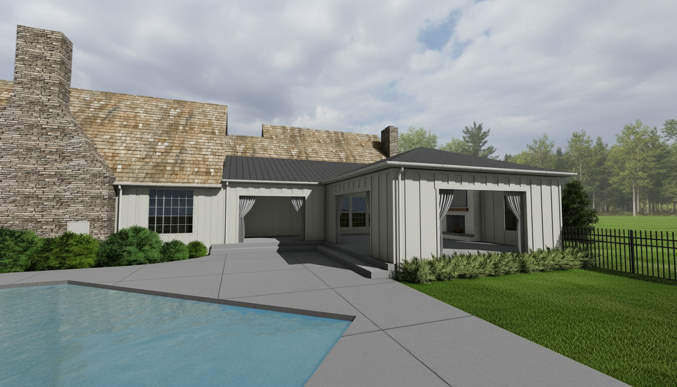 photorealistic renovation of the provided room without changing layout or camera replace all kitchen cabinets with white full overlay shaker and modern horizontal black drawer pulls and vertical door pulls stainless fridge without water on door added at left end with uppers above add 24 30 inch stainless range to right of sink with simple stainless hood and shaker cabinet above repair ceiling and install 4 inch white trim recessed lights at existing holes swap fan for modern white low profile fan with light replace all tile with warm white oak matte finish flooring like southern luxe surfside across all visible spaces repair drywall and paint all walls warm white with white trim replace bedroom door hardware with modern black lever add a small 2 person dining set near the new refrigerator in the left foreground stage a compact living area on the right light sofa coffee table low console keep clear walkways show a neatly made bed visible through the rear bedroom doorway remove all debris and damage bright neutral daylight and clean realistic details do not add anything else other than what is in this prompt do not add any windows or doors or remove any walls